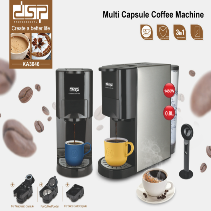 - Máy pha cà phê DSP KA3046 là một trong những loại máy pha cà phê 3 trong 1 mới nhất trên thị trường, nguyên liệu sử dụng là cà phê bột hay một viên nén hình nón, có chứa cà phê trong đó.