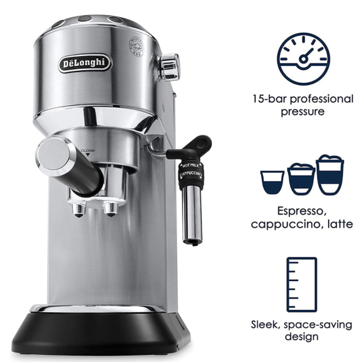 - Máy pha cà phê được làm từ chất liệu cao cấp, vừa bảo đảm an toàn vì không sản sinh ra các chất độc hại khi pha cà phê, vừa giữ được sự độ mới, giúp kéo dài tuổi thọ cho sản phẩm. Kim loại bóng bẩy, những phím cảm ứng mờ và biểu tượng nổi trên mặt khay tạo mang đến sự đa dạng phong cách cho thiết kế độc nhất của Dedica. Sản phẩm có thiết kế đơn giản, tiện lợi trong quá trình sử dụng. Máy có tông màu bạc sang trọng, phù hợp sử dụng trong nhiều không gian khác nhau, mang lại vẻ tinh tế cho ngôi nhà của bạn. Một số chức năng tiện ích khác