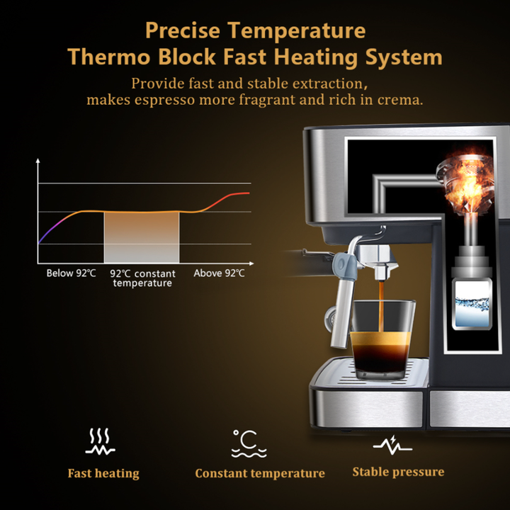 Bơm Italy áp suất 20 bar tạo ra tách cà phê đậm đà Công suất 1400W, điện áp 220-240V/50Hz-60Hz Gia nhiệt nhanh chóng, đảm bảo cà phê chiết xuất với nhiệt độ lý tưởng nhất