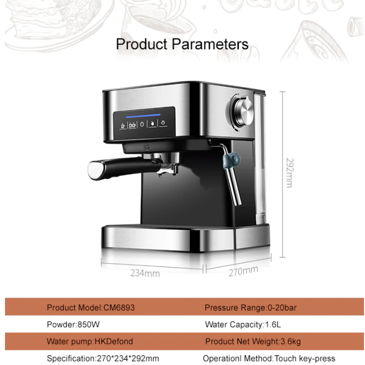 Bơm Italy áp suất 20 bar tạo ra tách cà phê đậm đà Công suất 1400W, điện áp 220-240V/50Hz-60Hz Gia nhiệt nhanh chóng, đảm bảo cà phê chiết xuất với nhiệt độ lý tưởng nhất