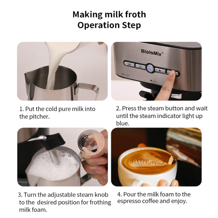 - Máy pha cà phê Espresso BioloMix CM6866 có công suất hoạt động mạnh mẽ lên đến 1050W, máy được hoạt động bằng điện, không cần mất nhiều thời gian để chờ đợi cafe pha xong với thao tác đơn giản, người dùng chỉ cần bỏ bột cafe vào lưới lọc, đổ nước vào máy, đóng nắp lại, đặt bình vào đúng vị trí để cà phê chảy vào bình và nhấn nút khởi động, đèn báo sáng sẽ sáng lên báo hiệu máy đã hoạt động và chờ vài phút là sẽ có ngay những ly cafe thơm ngon để thưởng thức. Hệ thống điều chỉnh bọt sữa thông minh