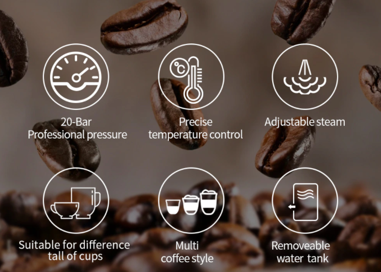 - Áp suất 20 bar tạo ra một ly Espresso với hương thơm đậm đà và lớp kem màu hạt ở trên.