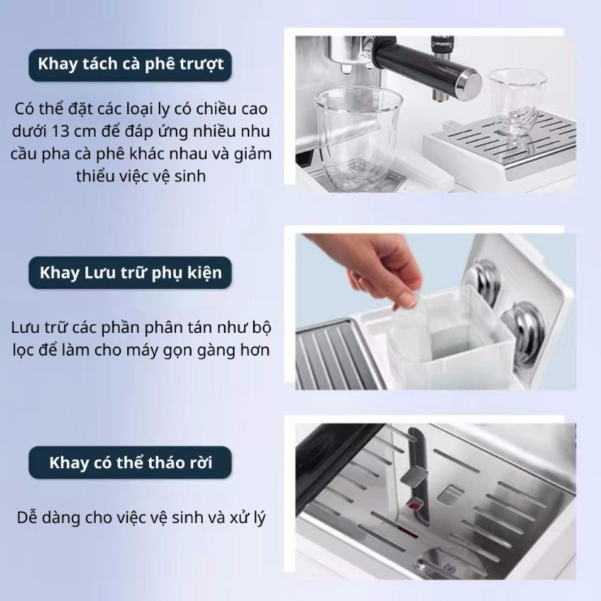 - Đặc biệt, máy còn thiết lập hệ thống điều chỉnh bọt sữa với 2 cấp độ: Bọt kem cho Cappuccino hoặc sữa nóng cho Caffe Latte kiểu Ý với thiết kế vòi xoay linh hoạt 360 độ. Kết hợp với giá giữ bộ lọc chuyên nghiệp làm bằng vỏ nhôm cao cấp và 3 phin lọc: Một tách, hai tách và gói cà phê Espresso giấy. Khay hứng nước nhỏ giọt có thể tháo rời