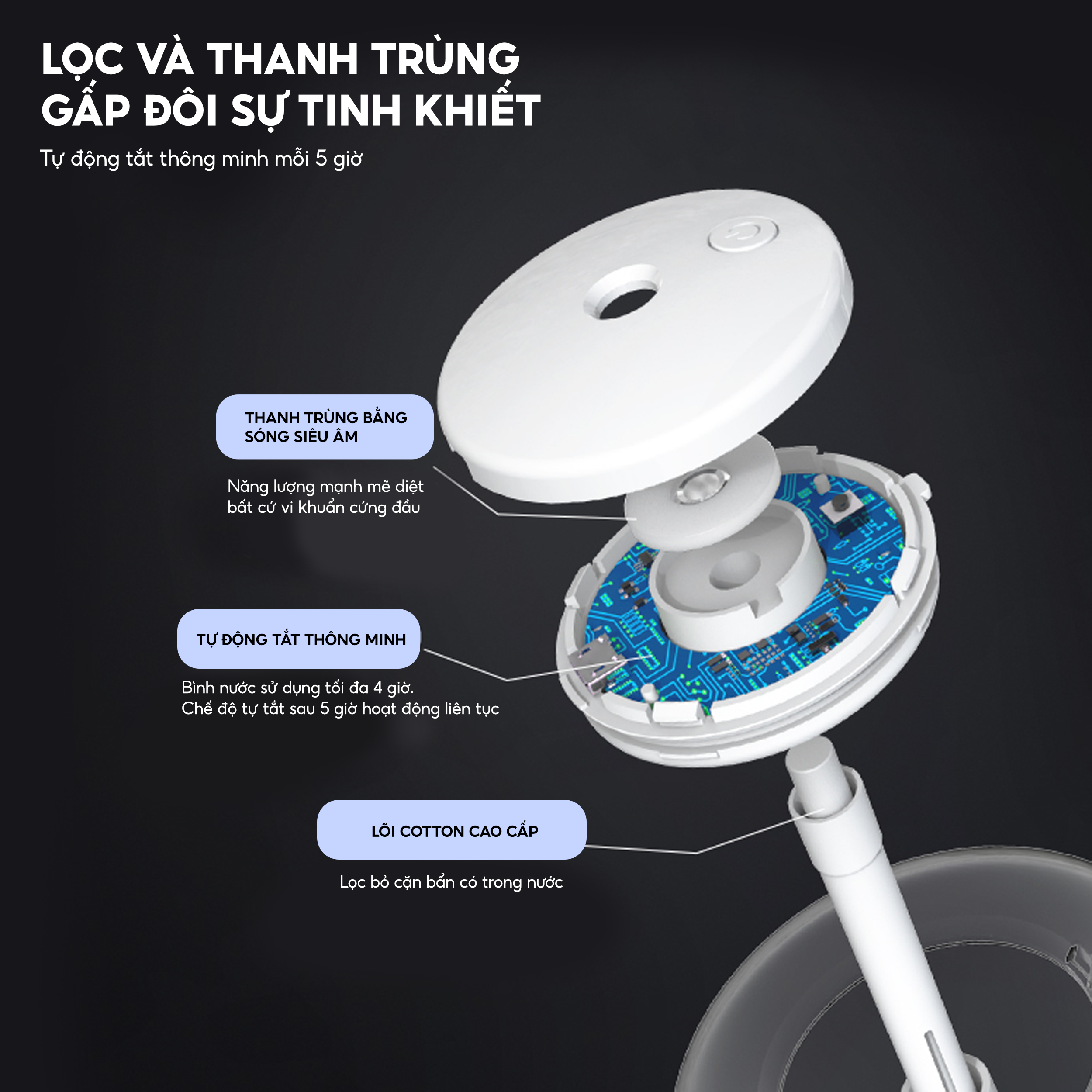 - Bình chứa nước lọc sóng âm, có thể ức chế sự phát triển của vi khuẩn.