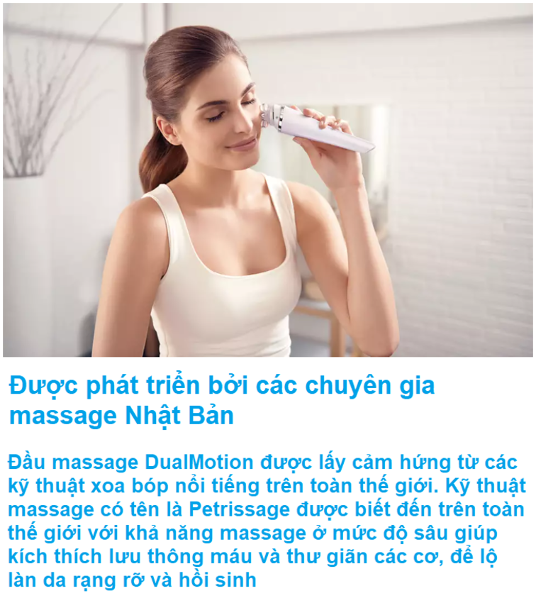 - Công nghệ DualMotion được lấy cảm hứng từ các kỹ thuật xoa bóp nổi tiếng trên toàn thế giới. Kỹ thuật mát-xa có tên Petrissage được biết đến trên toàn thế giới với khả năng mát-xa ở mức độ sâu giúp kích thích lưu thông máu và thư giãn cơ bắp, để lộ làn da rạng rỡ và hồi sinh Được thiết kế hoàn hảo để vệ sinh tối ưu
