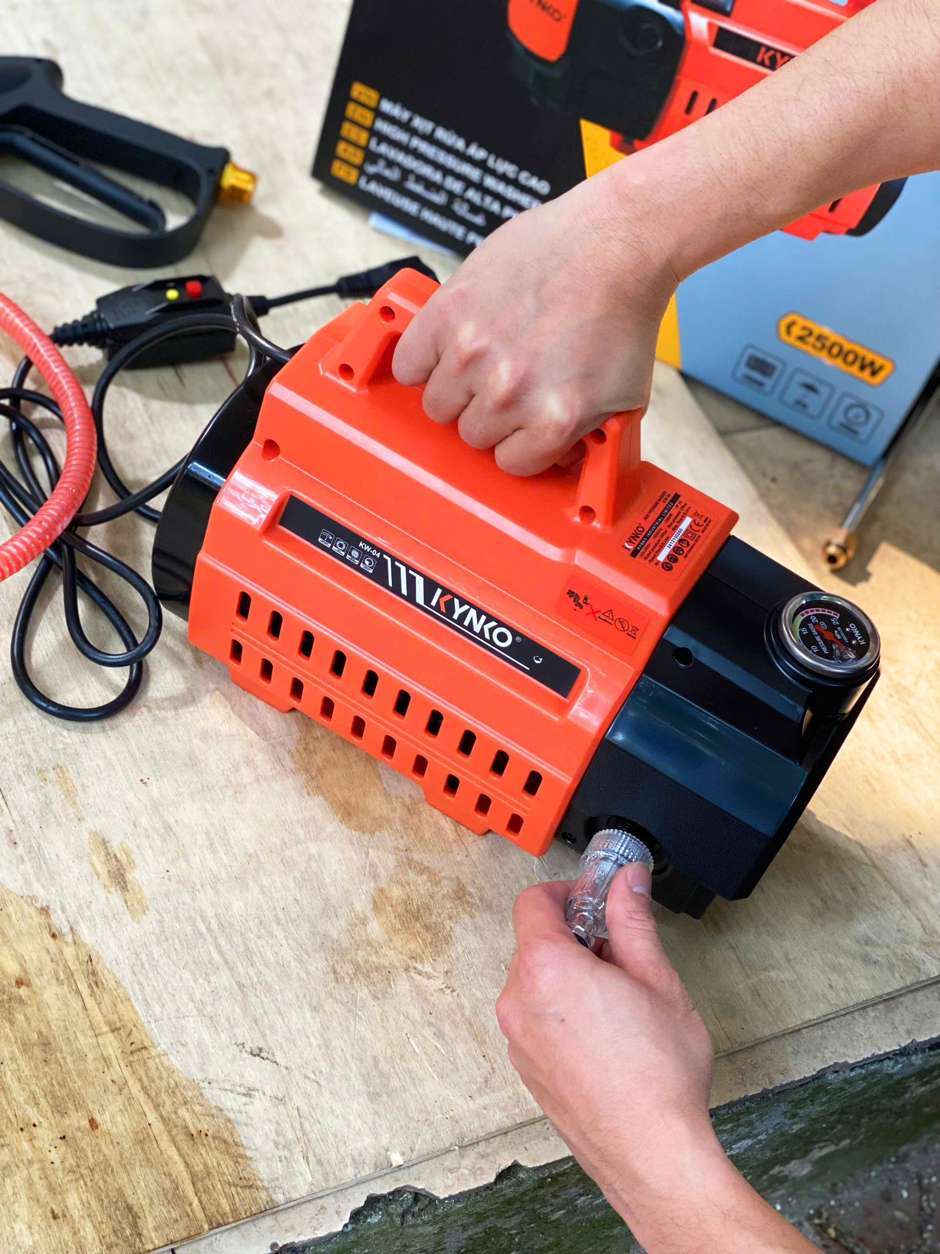 Máy rửa xe áp lực cao nhập khẩu chính hãng Kynko KW04 siêu bền THÔNG SỐ KỸ THUẬT Điện áp: 220v Công suất: 2500w Áp lực phun: 120bar Lưu lượng max: L/min Trọng lượng: 14kg CHẾ ĐỘ BẢO HÀNH Bảo hành chính hãng 06 tháng tại Kynko Việt Nam hoặc các trung tâm bảo hành sửa chữa ủy nhiệm của Kynko. Kích hoạt bảo hành điện tử hoặc tra cứu thời gian bảo hành bằng cách quét mã QR trên con tem gắn trên thân máy.