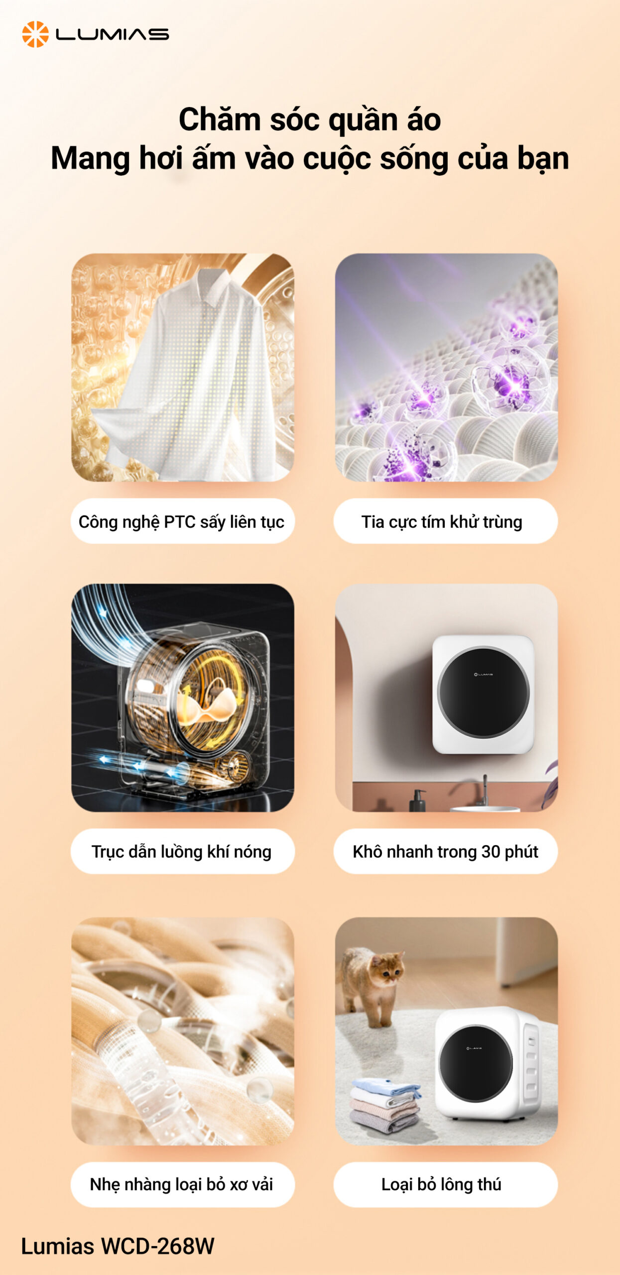 Mua tại TiktokTên sản phẩm Máy sấy quần áo Lumias WCD-268W Model WCD-268W Công suất tiêu thụ 800W Nguồn điện 220-240V/50-60Hz Công nghệ sấy PTC Tiện ích Khử trùng bằng tia cực tím 360° Sấy khô nhanh trong 30 phút Loại bỏ mùi hôi (bằng hơi nước) Hệ thống lọc kép loại bỏ tóc, lông thú, vải vụn Thiết kế đường dẫn luồng khí trục Khối lượng sấy 4kg Khối lượng 14.5kg Kích thước 480 x 400 x 560mm