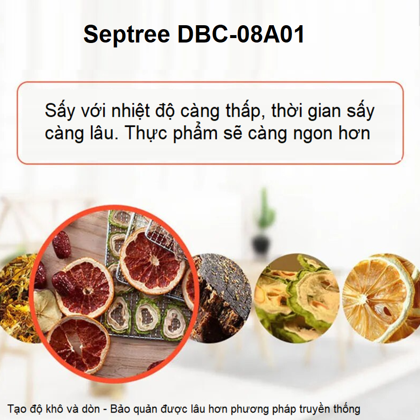 - Vì là thiết bị sấy có dung tích nhỏ nên giải nhiệt của Septree DBC-08A01 giao động từ 20 độ C đến tối đa 90 độ C có thể sấy hoa quả, thực phẩm đa dạng các loại. Tuy nhiên đối với các loại hoa quả, thực phẩm mọng nước và tinh dầu, thời gian sấy sẽ kéo dài hơn.