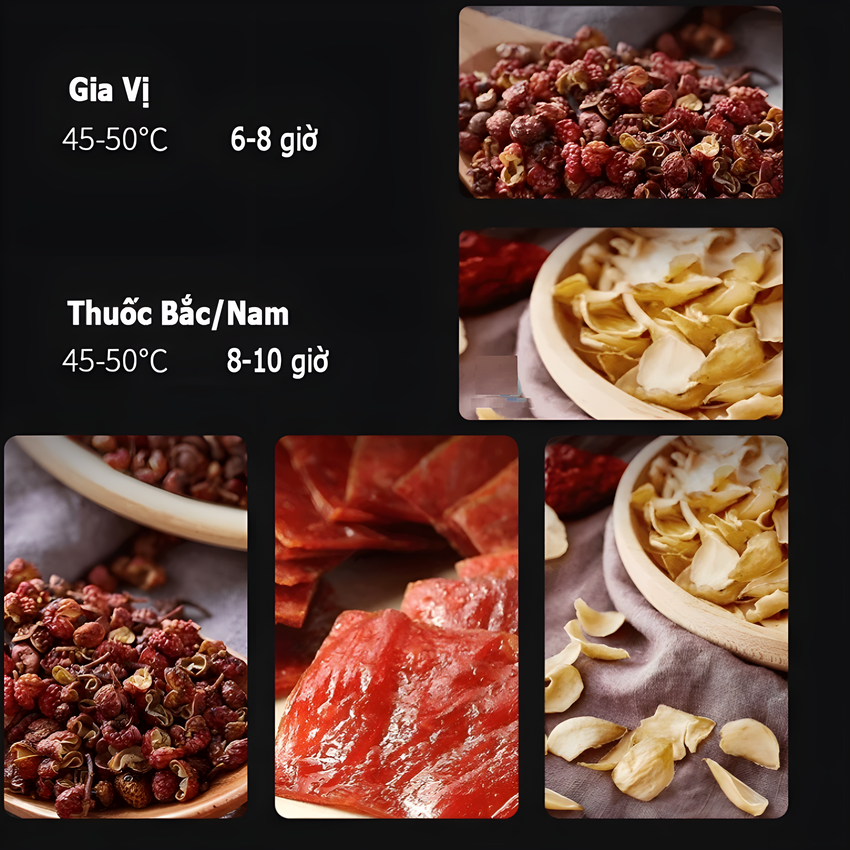 - Nếu bạn cần sử dụng trong việc sấy khô các loại thảo dược, hoa trà, thì mức nhiệt giao động từ 40 đến 55°C là phù hợp nhất: lá thuốc, rễ thuốc, hoa… sẽ được sấy khô mà không bị mất chất.