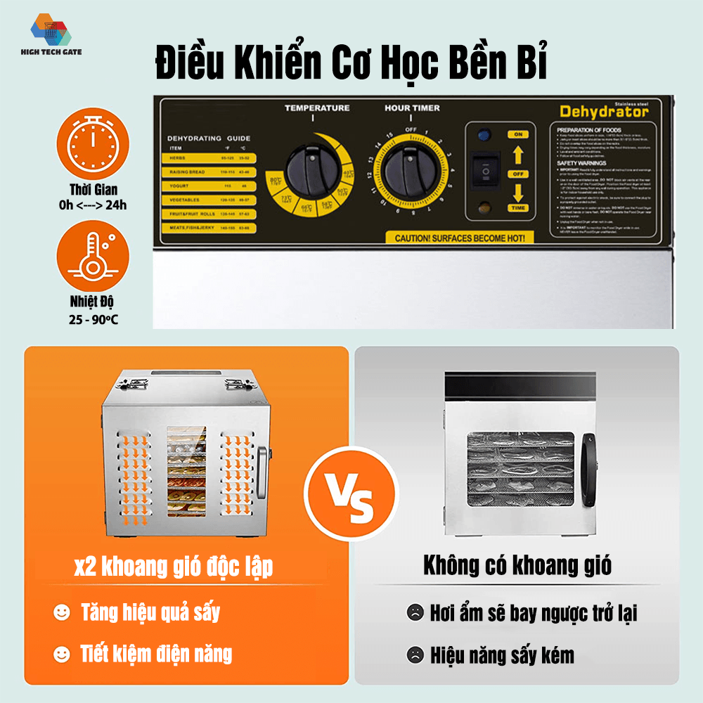 - Nhiệt độ của máy HTG-ST01 có thể đạt mức 25 ~ 90℃ giúp bạn có thể sấy được nhiều loại hoa quả và thực phẩm, trái cây, rau củ quả, dược liệ khác nhau với thời gian khác nhau. Đặc biệt, máy sấy còn được trang bị hệ thống cảm biến nhiệt sẽ tự động ngắt khi nhiệt độ sấy vượt mức nhiệt tối đa, đảm bảo an toàn cho máy và cả người sử dụng.