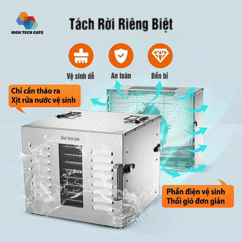- Với thiết kế cực kì đặc biệt, giúp người dùng có thể sở hữu 1 chiếc máy sấy thực phẩm vừa bền bỉ, vừa hiệu quả mà lại dễ dàng sử dụng. Máy sấy thực phẩm inox HTG-ST01 được tách biệt 2 phần riêng biệt phần điện và phần khoang sấy, giúp việc vệ sinh cực kì dễ dàng. Trang bị dung tích lớn hơn so với các máy cùng phân loại, khay sấy inox kích thước lớn lên đến 40x40cm, có 10 khay hoàn chỉnh. Có thể sấy khô được nhiều thực phẩm và dược liệu hơn so với các máy trên thị trường cùng với số khay.