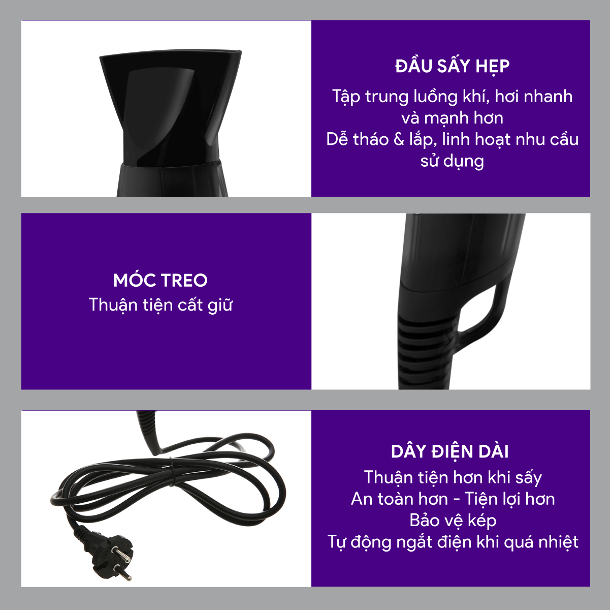 2 tốc độ, 4 chế độ sấy Chipset điều khiển nguồn điện để chống quá nhiệt, chống bỏng Làm khô tóc siêu nhanh, chỉ trong 2-3 phút Thiết kế sang trọng, kích thước gọn và