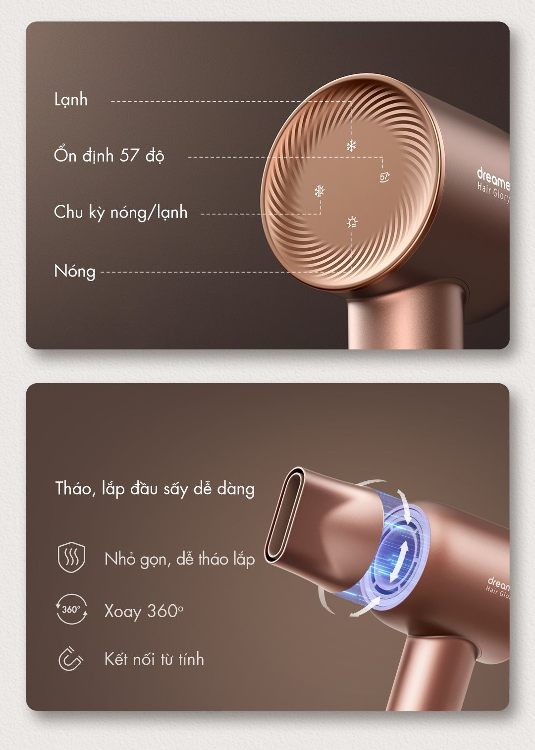 2 tốc độ, 4 chế độ sấy Chipset điều khiển nguồn điện để chống quá nhiệt, chống bỏng Làm khô tóc siêu nhanh, chỉ trong 2-3 phút Thiết kế sang trọng, kích thước gọn và trọng lượng nhẹ Thiết kế siêu gọn-nhẹ Định hướng là một sản phẩm chuyên phục vụ nhu cầu sấy và tạo kiểu cho cá nhân, Dreame tập trung phát triển mấy sấy tóc Dreame Glory với kích thước siêu gọn và trọng lượng nhẹ chỉ 345 gram. Không chỉ sở hữu thiết kế gọn gàng và trọng lượng nhẹ, Dreame Glory Standard còn được thiết kế để giúp người dùng cầm lâu sử dụng mà không bị mỏi tay hay khó chịu.  Sản phẩm ra mắt với 2 màu là Rose Gold và Cloud White đi kèm một phụ kiện tạo kiểu rời, được thiết kế để kết nối với thân máy bằng nam châm.   Các công nghệ trên Máy sấy tóc Dreame Nhằm mang đến một trải nghiệm sử dụng hoàn toàn mới cho khách hàng Việt Nam, Dreame Glory Hair Dryer được trang bị loạt công nghệ tiên tiến nhằm đảm bảo khả năng làm khô nhanh chóng cho tóc, vừa tránh để tóc bị cuốn vào trong, vừa an toàn về mặt điện năng. Ngoài ra, việc trang bị một chipset điều khiển nhiệt độ để tránh quá nhiệt, không gây bỏng da đầu và an toàn điện năng, chống giật. Phụ kiện sấy tóc kết nối với thân máy qua kết nối nam châm Chipset điều khiển nguồn điện để chống quá nhiệt, chống bỏng, duy trì nhiệt độ ổn định Làm khô tóc chỉ trong 2-3 phút (tóc nữ ngang vai)   4 mức nhiệt, 2 tốc độ thổi Dreame cho biết, để đám ứng nhu cầu sử dụng đa dạng của mỗi người dùng, hãng trang bị cho Máy sấy tóc Dreame Glory 4 cấp độ nhiệt đi kèm với 2 tốc độ thổi. Kết hợp với nhau, người dùng có tổng cộng 8 cách sử dụng khác nhau. Ngoải ra, người dùng còn có thể kết hợp với phụ kiện để chăm sóc tóc óc mượt và suôn mềm hơn. Dreame áp dụng kỹ thuật giảm tiếng ồn hiệu quả vốn đã có trên các sản phẩm Máy hút bụi của hãng, để giảm độ ồn và tạo sự thoải mái tối đa cho khách hàng.   Thông số kỹ thuật Tên sản phẩm: Máy sấy tóc Dreame Glory Nguồn điện: 220V~50Hz Công suất: 1600 Watt Kích thước sản phẩm: 72 x 82 x 255 mm Tốc độ động cơ: 110,000 vòng/phút Tốc độ thổi: 70m/giây Trọng lượng: 345 gram Chế độ nhiệt: 4 Chế độ gió: 2