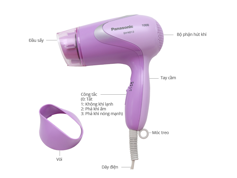 Thiết kế nhỏ gọn với công suất 1000 W mạnh mẽ sấy tóc nhanh khô, tiết kiệm điện +/ ĐẶC ĐIỂM NỔI BẬT Máy sấy tóc Panasonic EH-ND13-V645 dễ dàng sử dụng chỉ với một
