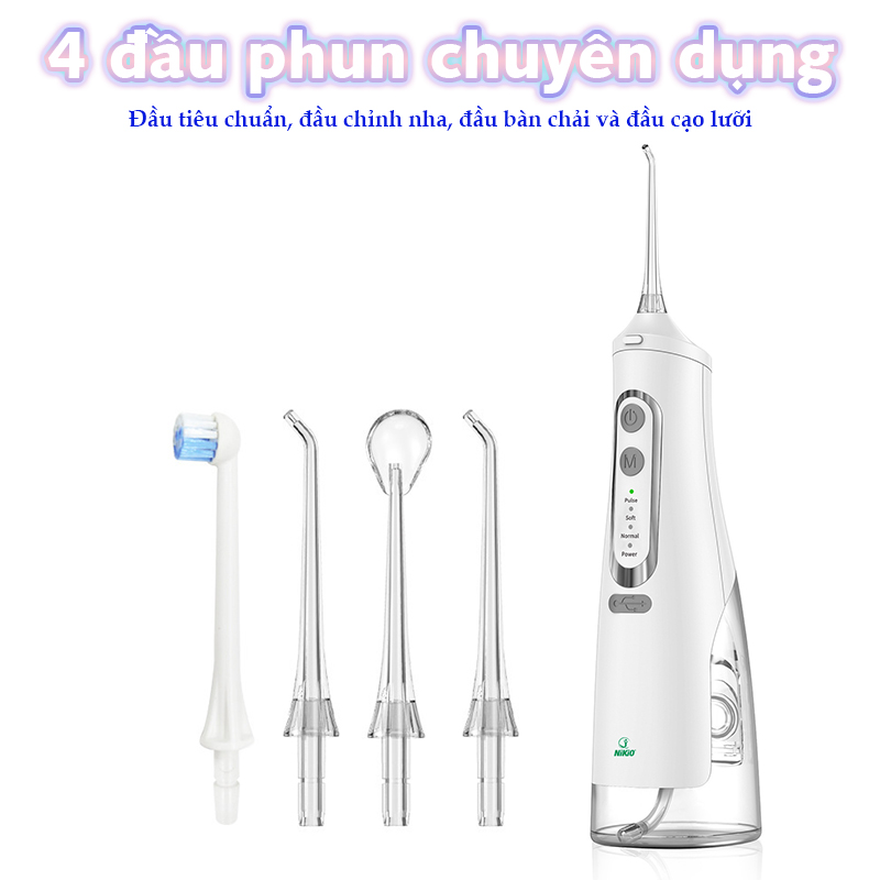 - Pin sạc dung lượng 1500mAh, thời gian sử dụng dài Ưu điểm của máy tăm nước làm sạch răng Nikio NK-M209: Áp lực nước mạnh mẽ, điều chỉnh linh hoạt Máy tăm nước mini dùng cho cá nhân Nikio NK-M209 được trang bị áp lực nước mạnh mẽ từ 40 - 120 PSI, giúp đánh bật thức ăn và mảng bám ngay cả ở những vị trí khó tiếp cận nhất. Người dùng có thể dễ dàng điều chỉnh 4 cường độ phun nước phù hợp với nhu cầu cá nhân để có thể làm sạch răng hiệu quả mà không làm đau nướu. Tia nước mịn 0.6mm – Làm sạch kẽ răng tối ưu Áp lực nước mạnh và tia nước siêu mịn với kích thước 0.6mm len lỏi vào từng kẽ răng, máy tăm nước Nikio NK-M209 có thể giúp bạn loại bỏ mảng bám và thức ăn dư thừa trong các kẻ răng hẹp mà không gây tổn thương nướu. Chức năng ghi nhớ cường độ phun thông minh Máy tăm nước làm sạch răng Nikio NK-M209 tích hợp chức năng ghi nhớ cường độ phun, giúp bạn tiết kiệm thời gian điều chỉnh ở những lần sử dụng tiếp theo. Vòi phun thiết kế đột phá xoay 360 độ Vòi phun của máy tăm nước cao cấp Nikio NK-M209 được thiết kế thông minh với khả năng xoay 360 độ. Sau khi đưa vòi phun vào miệng, góc của vòi có thể điều chỉnh theo ý muốn để làm sạch răng miệng một cách toàn diện không gốc chết. 4 đầu phun chuyên dụng thay đổi theo nhu cầu Máy tăm nước vệ sinh răng miệng Nikio NK-M209 được trang bị 4 loại đầu phun khác nhau, bao gồm đầu tiêu chuẩn, đầu chỉnh nha, đầu bàn chải và đầu cạo lưỡi. Người dùng có thể lựa chọn vòi phù hợp với nhu cầu sử dụng của mình. Việc sử dụng đúng loại vòi phù hợp với nhu cầu sẽ giúp việc vệ sinh răng miệng đạt hiệu quả cao.