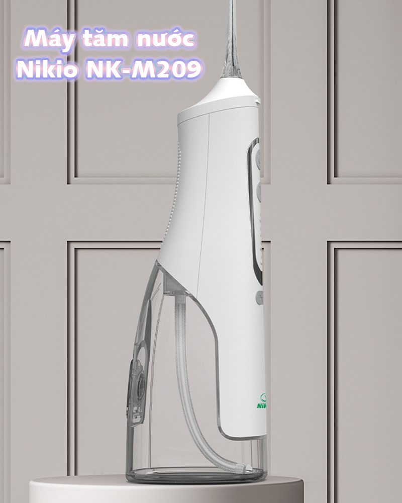 Máy Tăm Nước Cầm Tay Nikio NK-M209 - Dung Tích Lớn 360ml, Hàng Chính Hãng Nếu bạn đang tìm kiếm một sản phẩm vệ sinh răng hiệu quatr tiện lợi, máy tăm nước Nikio NK-M209 có thể là một sự lựa chọn tuyệt vời. Với thiết kế độc đáo và nhiều tính năng hữu ích, máy tăm nước Nikio NK-M209 có thể giúp bạn loại vụn thức ăn bám sâu trong răng và bảo vệ sức khỏe răng miệng của bạn một cách hiệu quả. Máy tăm nước vệ sinh răng Nikio NK-M209 không chỉ có tính năng vượt trội mà còn có thiết kế nhỏ gọn, đẹp mắt và tiện lợi, giúp người dùng sử dụng một cách dễ dàng và thoải mái. Đặc điểm nổi bật của máy tăm nước làm sạch răng Nikio NK-M209: