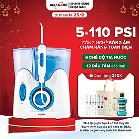 - Áp dụng tới ngày: 31/12/2022 Máy tăm nước Max456 Plus là sản phẩm thuộc dòng tăm nước gia đình, được kiểm định chất lượng nghiêm ngặt bởi thương hiệu Maxcare Nhật Bản. Sản phẩm có mặt trên thị trường được gần 10 năm và hiện đang là sản phẩm thuộc Top Máy Tăm Nước Bán Chạy Nhất tại Việt Nam. Máy tăm nước vốn là sản phẩm được các nha sĩ sử dụng tại các phòng nha, dùng áp lực tia nước để làm sạch mảng bám và thức ăn thừa, vệ sinh răng miệng ở cả những nơi bàn chải kẽ răng hay chỉ nha khoa cũng không làm sạch tới. Hiện nay, máy tăm nước được thiết kế để trở thành công cụ tiện lợi và cần thiết trong mỗi gia đình, vệ sinh răng miệng nhanh và sạch mà không cần phải đến phòng khám, đặc biệt là với người niềng răng hoặc làm răng thẩm mỹ. Máy tăm nước sóng siêu âm Maxcare Max456Plus: Máy tăm nước Maxcare Max456plus là công nghệ vệ sinh răng miệng mới nhất đến từ Nhật Bản với những ưu điểm vượt trội: Áp suất nước dễ dàng điều chỉnh (6 mức độ khác nhau): áp suất nước cao và nhịp độ mạnh để tối ưu làm sạch, tia nước nhẹ nhàng cho nướu nhạy cảm 12 đầu tăm nước (nhiều nhất trên thị trường hiện nay) cho cả nhà 4-5 người sử dụng, có đầu rửa mũi, đầu vệ sinh lưỡi. Bình chứa dung tích lớn: 800ml, thoải mái cho cả nhà sử dụng Có khoang chứa đầu tăm riêng biệt, đảm bảo vệ sinh Hệ thống động cơ được hàn kín ngăn ngừa nước rò rỉ, đảm bảo an toàn khi sử dụng Có thể được sử dụng với nước, nước súc miệng hoặc chất kháng khuẩn cho hơi thở thơm mát Đầu tăm có thể xoay 360 độ, làm sạch cả những nơi bàn chải không thể đánh tới Công nghệ sóng siêu âm hiện đại, dòng máy êm nhất của Maxcare Lợi ích khi sử dụng Máy tăm nước cho cả gia đình Giúp giữ cho răng sạch sẽ, dùng lâu dài hạn chế cao răng Massage nướu, ngăn ngừa các bệnh về nướu Là sự lựa chọn tốt nhất cho những người bị bệnh viêm nha chu, viêm nướu, sâu răng, những người đang có răng giả, cầu mão răng hoặc đang niềng răng chỉnh hình. Sạch sâu và nhanh chóng, làm sạch được những kẽ răng hẹp mà chỉ nha khoa hay bàn chải đánh răng không thể tới Không gây thưa răng, không ảnh hưởng đến nướu như tăm tre truyền thống Không lo hóa chất độc hại như tăm tre. Tiết kiệm thời gian và tiện dụng hơn bàn chải kẽ răng Đặc biệt an toàn với những người niềng răng, trồng răng, bọc răng sứ, răng thẩm mỹ.... Phù hợp với những người hay bị giắt răng, chảy máu chân răng và các bệnh răng miệng... Được khuyên dùng bởi các nha sĩ hàng đầu Là sản phẩm phân phối bởi Maxcare Việt Nam - thương hiệu chăm sóc sức khỏe uy tín 15 năm Đối tượng sử dụng