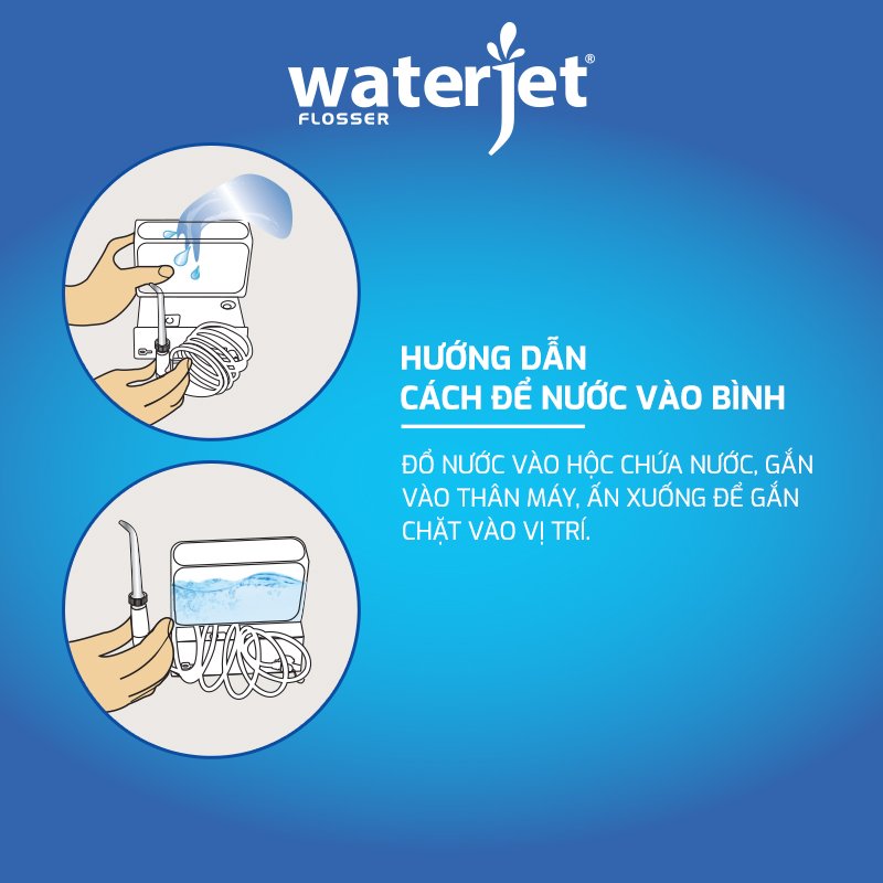 - Xuất xứ thương hiệu: Mỹ. Sản xuất tại: Trung Quốc. Công dụng của máy tăm nước Waterjet Classic Máy tăm nước Waterjet Classic giảm mảng bám vi khuẩn nằm sâu dưới nướu, ngăn ngừa các bệnh về nướu, là giải pháp tối ưu cho hàm răng của bạn và cả gia đình bạn. – Massage giúp cho máu dưới nướu lưu thông tốt hơn, giảm mảng bám dưới nướu và kẽ răng, giữ cho răng sạch sẽ, ngăn ngừa các bệnh về nướu. – Máy tăm nước Waterjet Classic hỗ trợ làm sạch vùng nướu cho bệnh nhân viêm nướu – viêm nha chu. – Vệ sinh cho người đang niềng răng, cấy ghép răng, đeo hàm giả… Hướng dẫn sử dụng của máy tăm nước Waterjet Classic – Chuẩn bị nước: Lấy bình chứa nước ra khỏi máy tăm nước và cho nước vào. Đặt bình nước trở lại bên trên thân máy. Ấn bình nước sao cho gắn chặt vào thân máy. – Gắn tip: Chọn đầu tip thích hợp và gắn vào tay cầm. Ấn cho đầu tip gắn thật chặt. – Thay đổi áp suất: Chỉnh áp suất đến mức ưa thích bằng cách trượt nút điều chỉnh lên xuống – Tay cầm điều khiển: Máy tăm nước được trang bị nút tạm ngưng trên tay cầm. Bạn có thể tạm thời ngưng dòng nước bằng cách ấn nút tạm ngưng trê tay cầm. Điều khiển hướng của dòng nước bằng cách xoay nút phía trên tay cầm. – Mở/ tắt máy: Sau khi đã đặt típ vào bên trong miệng, bật máy tăm nước bằng tay còn lại. Mím môi để tránh nước bắn ra. Luôn luôn ấn nút tạm ngưng hay tắt máy khi rút típ ra khỏi miệng. – Bắt đầu sử dụng: Đặt tip vào bên trong miệng, cúi thấp người xuống bồn nước. Mím môi để nước khỏi bắn ra, trong khi vẫn để nước chảy xuống bồn. Mở máy. – Để có kết quả tốt: Hướng đầu tip với răng tạo thành góc 90 độ. Bắt đầu với răng phía bên trong, di chuyển tip theo đường nướu, dừng lại trong một thời gian ngắn kẽ răng. Tiếp tục cho đến khi mọi điểm xung quanh và kẽ răng được làm sạch. – Khi sử dụng xong: Tắt máy, đổ phần nước còn lại đi và úp bình nước trở lại vào thân máy. Nếu sử dụng nước súc miệng, sau khi dùng xong phải đổ hết nước súc miệng đi. Cho nước máy vào, chạy khoảng 30 giây dđể lấy hết nước súc miệng ra khỏi dây. – Thay tips: Để thay đầu tip, ấn và giữ đầu tay cầm thay típ bên trên tay cầm và kéo đầu típ ra. Thông tin thương hiệu Waterjet Tại Mỹ, Waterjet là thương hiệu lâu đời với các sản phẩm phục vụ nhu cầu chăm sóc sức khỏe gia đình. Một số sản phẩm của Waterjet được khách hàng yêu thích có thể kể đến bàn chải điện sóng âm hay máy tăm nước không dây. Các sản phẩm vệ sinh răng miệng của Waterjet đều được chứng nhận lâm sàng, FDA công nhận và hoàn toàn không chứa BPA, tuyệt đối an toàn cho sức khỏe răng miệng. Đối tượng nên dùng máy tăm nước Waterjet Classic – Dùng vệ sinh răng miệng hằng ngày cho mọi người. – Dùng vệ sinh cho bệnh nhân viêm nướu, chỉnh nha, cấy ghép implant… Lưu ý Không ấn nút tháo đầu tip khi đang sử dụng máy tăm nước
