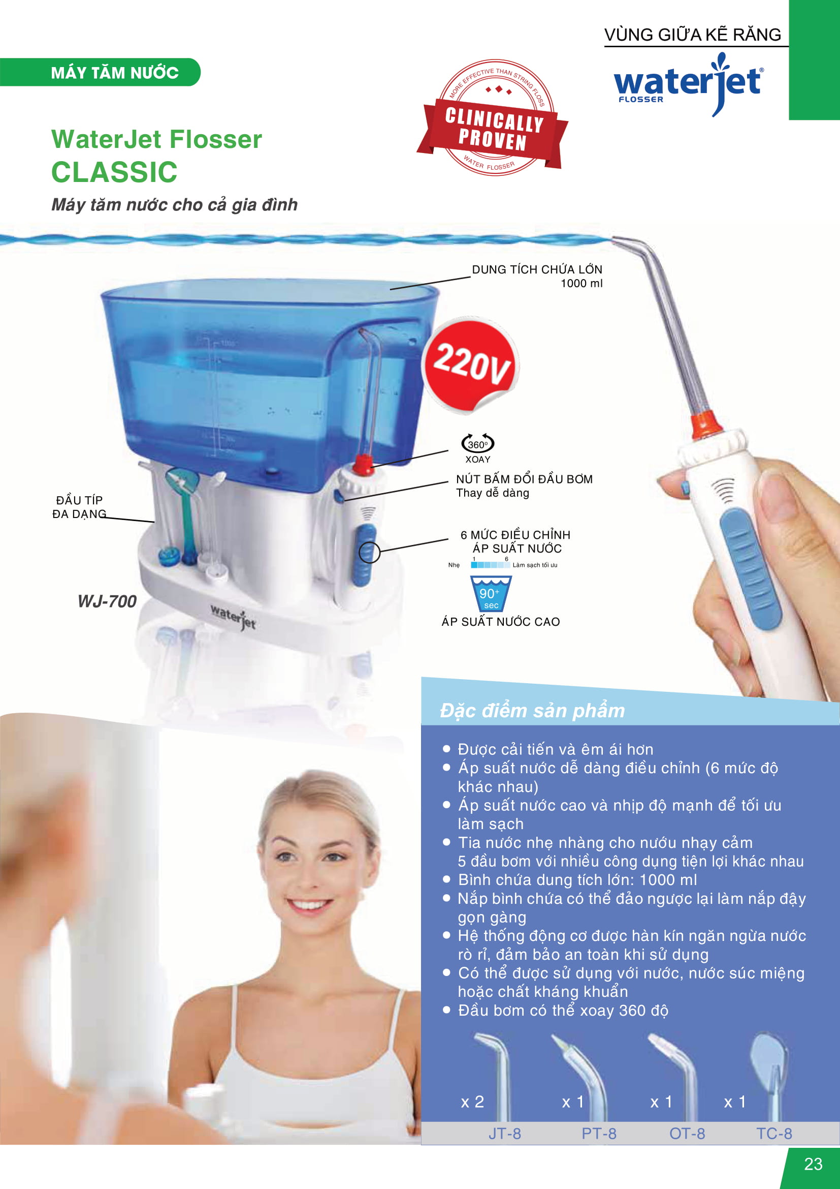 - Máy tăm nước cá nhân Waterjet Flosser Classic là thiết bị hoàn hảo để giữ cho nướu khỏe mạnh. Máy được thiết kế đặc biệt cho những người có nướu nhạy cảm (hay bị chảy máu), niềng răng chỉnh nha, cấy ghép, mão răng hoặc cầu răng, răng mọc lệch.