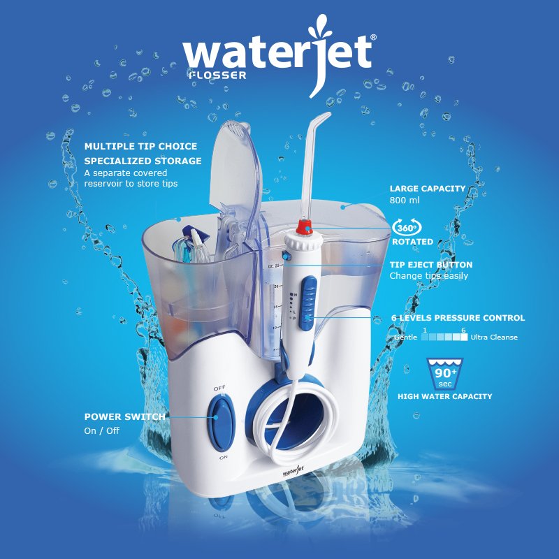 - Với 12 đầu tăm kèm theo (4 tiêu chuẩn + 2 chỉnh nha + 2 vệ nội nha + 2 vệ sinh lưỡi + 2 vệ sinh mũi) và 6 mức điều chỉnh áp suất, WaterJet Ultra chắc chắn là máy tăm nước đa chức năng đáp ứng nhu cầu vệ sinh răng miệng hàng ngày cho không chỉ cho một cá nhân mà còn cho cả gia đình.