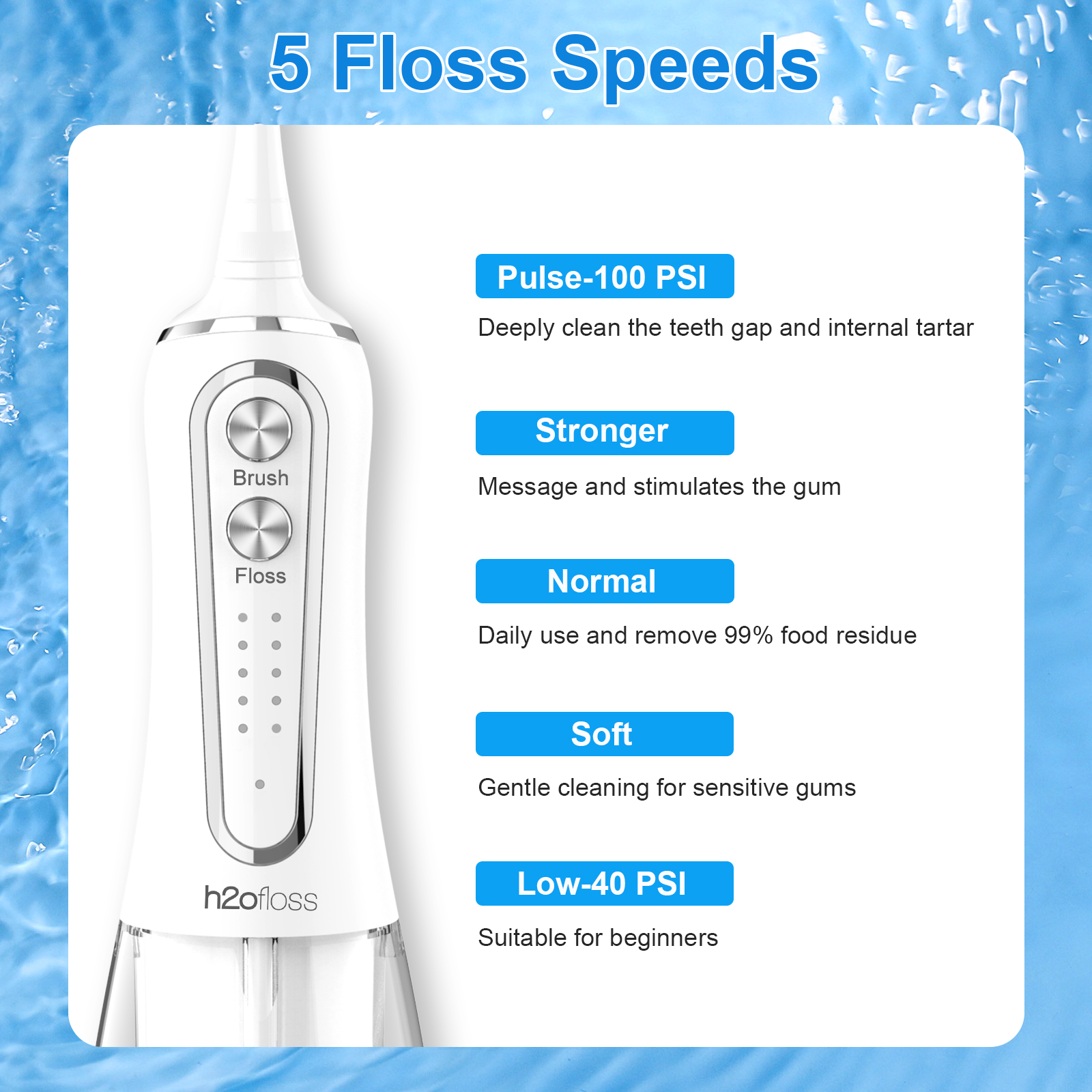 Làm sạch hiệu quả: Tia nước nhẹ nhàng giúp loại bỏ đến 99,9% mảng bám, ngay cả ở những khu vực mà bàn chải thông thường khó tiếp cận. 5 mức điều chỉnh áp lực
