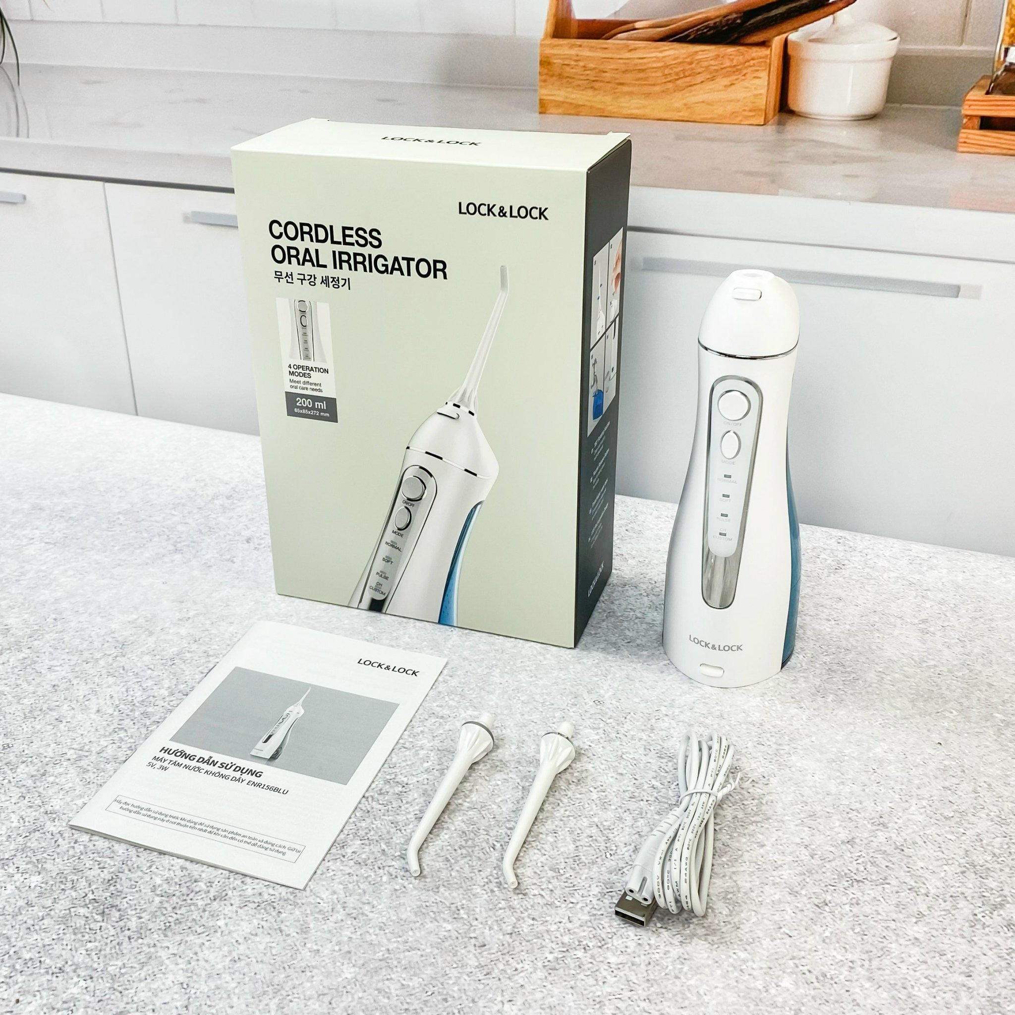 - Bảo quản thiết bị ở nơi khô ráo, mát mẻ, tránh nhiệt độ cao, ánh nắng trực tiếp. Máy Tăm Nước Không Dây Lock&Lock Cordless Oral Irrigator ENR156BLU gồm 4 chế độ hoạt động: Đáp ứng các nhu cầu chăm sóc răng miệng khác nhau. Đầu tăm xoay 360 °: Làm sạch răng miệng theo nhiều hướng. Nút nhả vòi phun: Dễ dàng tháo vòi phun. Bình chứa nước có thể dễ dàng tháo rời, thuận tiện cho làm đầy và làm sạch bình nước Thiết kế cổng sạc USB có thể sạc đầy trong vòng 4 giờ, và một lần sạc đầy có thể sử dụng được lên đến 20 ngày. Thông Số Kỹ Thuật: Dung tích: 200ml Màu sắc: Xanh da trời Chất liệu: Nhựa ABS, nhựa PC Kích thước: 65x85x205mm Sản phẩm bao gồm: 02 đầu tăm, 01 dây sạc đi kèm (không kèm adapter), 01 thân máy tăm nước.