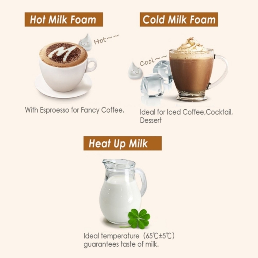 - Bạn có thể sử dụng máy tạo bọt sữa để pha chế nhiều loại đồ uống; tạo ra những hương vị đặc biệt mà bạn khó làm được bằng phương pháp pha chế thủ công. Máy tạo bọt sữa nóng vận hành hoàn toàn tự động; thời gian hoàn thành đồ uống siêu nhanh. Dễ dàng vệ sinh: