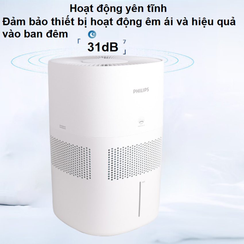 - Đèn màu Vàng độ ẩm môi trường nhỏ hơn 40%, Đèn màu Xanh Lá độ ẩm môi trường hiện tại từ 40% đến 65%, Đèn màu Xanh Dương độ ẩm môi trường hiện tại lớn hơn 65%. Hoạt động yên tĩnh