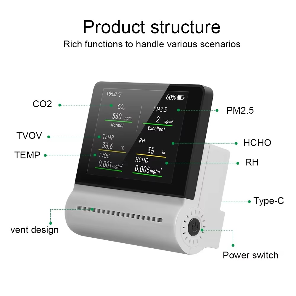 Tính năng và lợi ích: Độ chính xác trong tầm tay bạn : Với độ chính xác nhiệt độ ấn tượng 0,1°C (32°F) và độ chính xác 0,001 mg cho TVOC và HCHO, NOYAFA JMS-16