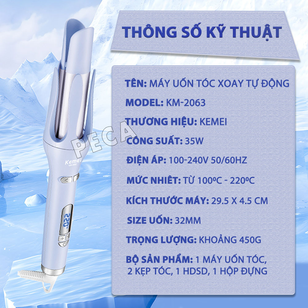 MÁY UỐN TÓC XOAY TỰ ĐỘNG KEMEI KM-2063 ĐIỀU CHỈNH 12 MỨC NHIỆT ĐỘ PHÙ HỢP VỚI MỌI LOẠI TÓC - CHÍNH HÃNG Kemei KM-2063 là dòng máy uốn tóc chuyên nghiệp, được thiết kế