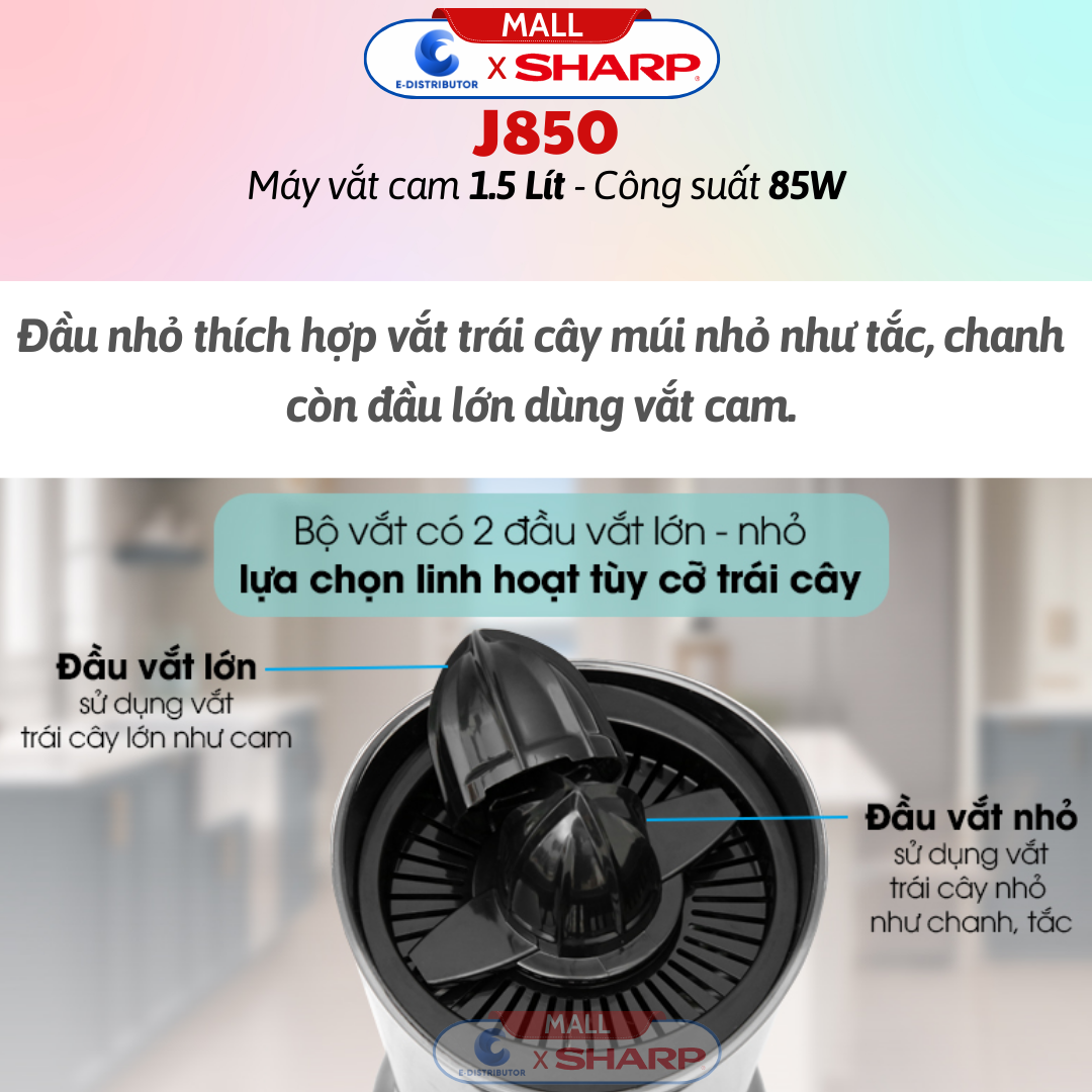 Bộ vắt Sharp EJ-J850-BK có 2 đầu vắt lớn và nhỏ tiện lợi để vắt trái cây có kích cỡ khác nhau. Trong đó đầu nhỏ thích hợp vắt trái cây múi nhỏ như tắc, chanh còn đầu lớn dùng vắt cam.