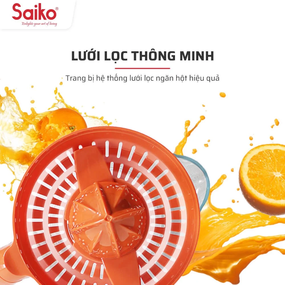 Máy vắt cam cao cấp Saiko CJ - 110 được trang bị hệ thống ngăn hột và loại bỏ xác cam, mang đến một ly nước cam thơm ngon một cách nhanh chóng.