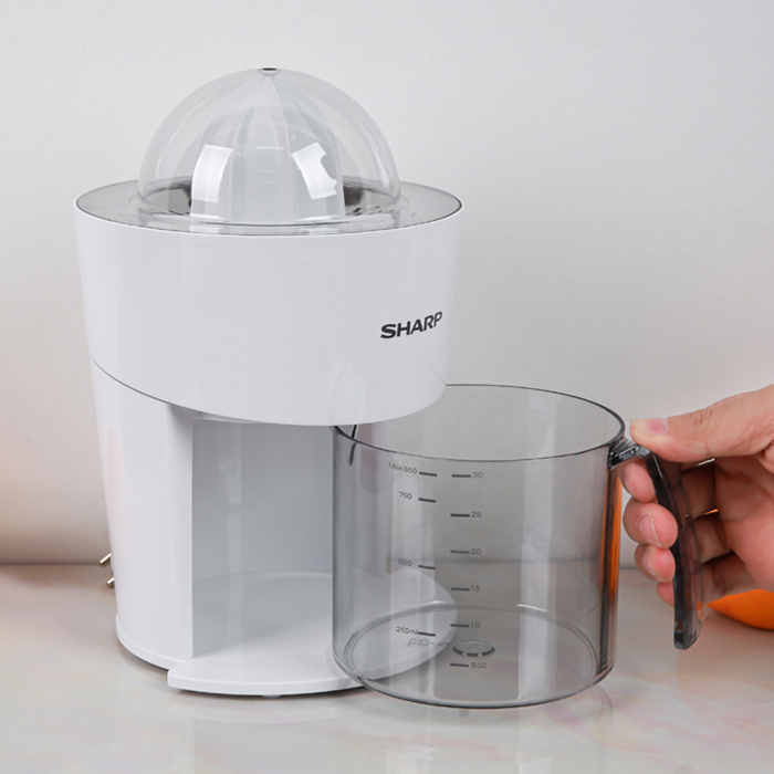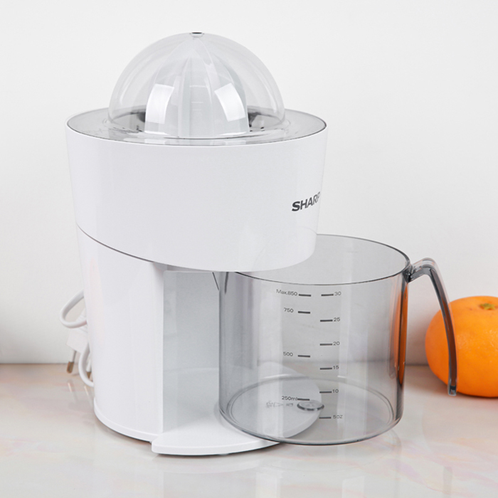 Máy vắt cam Sharp thiết kế gọn nhẹ, màu trắng sáng tươi trẻ, có tay cầm chắc chắn Chuyên dụng để vắt các loại hoa quả họ cam như cam, bưởi, quýt, chanh,… đáp ứng nhu