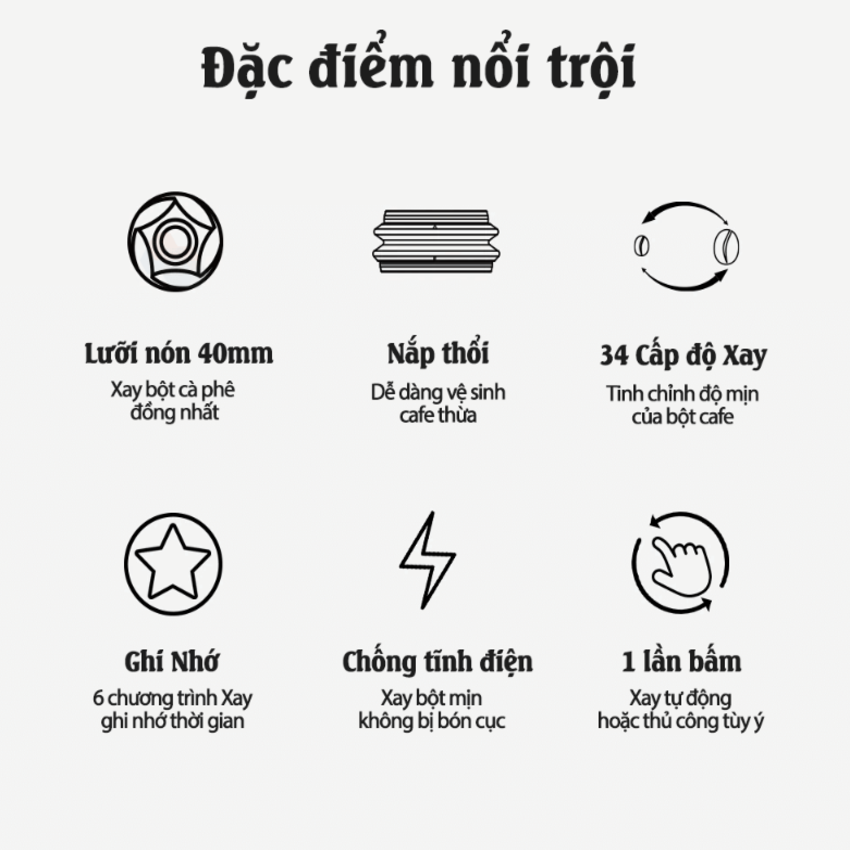- Với lưỡi dao chất liệu thép không gỉ SS420 bền bỉ bền bỉ sở hữu 34 cấp độ xay, từ dạng thô đến dạng mịn. Chính vì thế nó có thể đáp ứng tối thiểu độ mịn cho 1 ly cà phê espresso chuẩn Ý. Thông số kỹ thuật