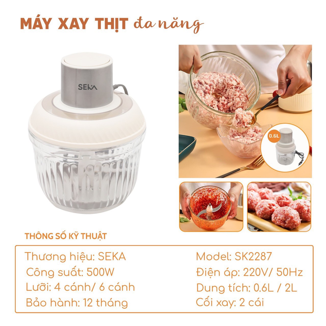 Máy xay thịt đa năng SEKA SK2287, 2 cối thủy tinh, thiết kế 4 - 6 lưỡi dao sắc bén, Công suất mạnh 500W Với công suất mạnh mẽ và dung tích lớn 2L cùng với 2 cối SEKA SK2287 là công cụ xay cắt thực phẩm hoàn hảo cho đại gia đình. Bằng thao tác đơn giản, người dùng có thể dễ dàng chế biến đa dạng nguyên liệu tươi như thịt, hành, rau thơm, đậu phộng và nhiều thực phẩm khác. ĐẶC ĐIỂM NỔI BẬT CỦA MÁY XAY THỊT SEKA: