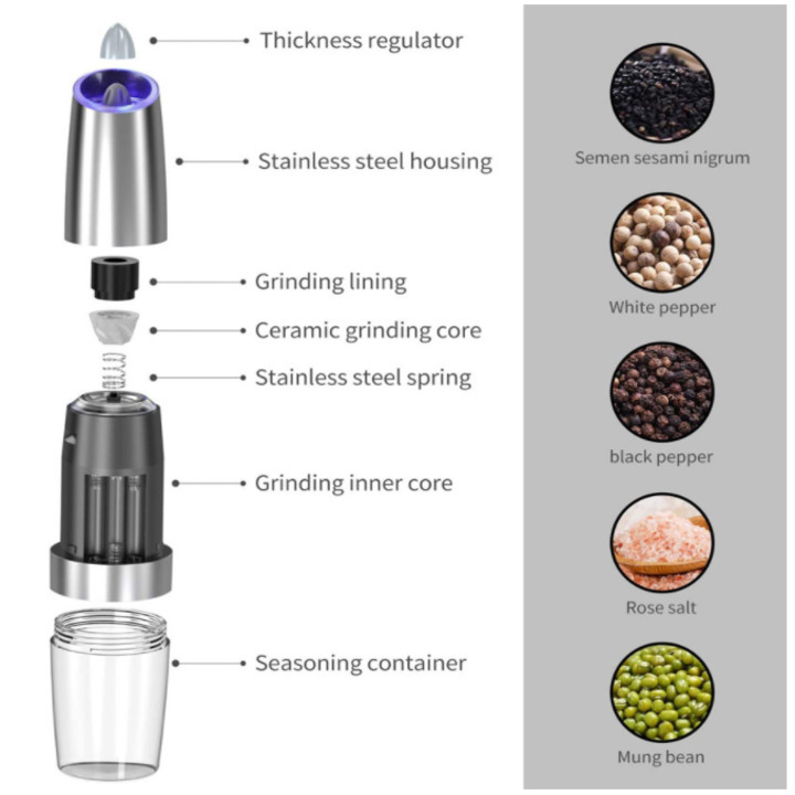 - Máy Nghiền Hạt Tiêu sáng tạo phân tán gia vị với đèn LED màu xanh bật khi máy xay hạt tiêu đang hoạt động.