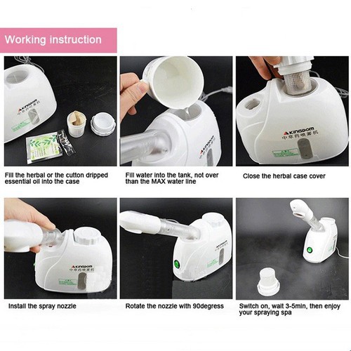 - Loại Bỏ dư thừa chất béo, da làm trắng giúp da mịn màng hơn 6. Xông hương liệu, thảo dược giúp trị một số bệnh về da cũng như đường hô hấp ***Hướng dẫn sử dụng: Bước 1: Bạn nên rửa mặt bằng xà phòng trung tính, không màu, không mùi, không gây kích ứng da hay sữa rửa mặt bạn dùng thấy hợp với loại da của bạn để tẩy trang và loại bỏ các chất bẩn, dầu nhờn trên da. Bước 2 Cho nước sôi để nguội vào phần chứa nước trong máy . Bỏ vài lát chanh , tinh dầu hay các loại thảo dược tươi vào trong ngăn đựng riêng trong máy . Đối với các bạn gái có làn da nhờn thì chanh tươi và bạc hà là sự lựa chọn tốt nhất. Còn đối với làn da nhạy cảm và khô thì bạn nên thêm hoa cúc La Mã (chamomile), hoa ylang-ylang hoặc chanh tươi. Ngoài ra, bạn cũng có thể dùng oải hương hay hương thảo (rosemary) nếu có làn da thường. Đối với da bị mụn bạn nên dùng tinh dầu đặc trị mụn ( Tea Tree Oil ) nhỏ 5-6 giọt vào ngăn chứa. Sau đó, bạn dùng một tấm khăn lớn và trùm khăn tắm quanh đầu để hơi nước không thoát ra ngoài, như vậy việc xông hơi cho mặt đạt hiệu quả cao hơn. Khi xông hơi, bạn nên chú ý vị trí của mặt sao cho nước nóng xông thẳng lên mặt và nhớ nhắm mắt lại để tránh thảo dược trong hơi nước có thể gây khó chịu cho đôi mắt của bạn. Một điều đáng lưu ý là bạn chỉ nên xông mặt từ 15 – 20 phút cho đến khi nước tự ngắt và không nên xông mặt quá 20 phút Bước 3 Sau khi xông hơi mặt xong, bạn hãy rửa lại mặt cho sạch bằng nước ấm và lau khô. Bạn có thể thực hiện phương pháp làm đẹp này khoảng 2 lần/tuần mà không hề gây hại cho làn da của mình. Bước 4 Bây giờ làn da của bạn đã sạch sẽ và các lỗ chân lông được mở ra, đây chính là lúc tốt nhất để bạn thực hiện các công đoạn tẩy tế bào chết da mặt và tiếp tục quá trình thứ 2 là đắp mặt nạ vì khi đó lỗ chân lông đang mở ra, giúp bạn dễ dàng lấy đi mọi bụi bẩn tận gốc và cũng là lúc đắp mặt nạ có tác dụng cao nhất vì khi đó các dưỡng chất sẽ được làn da hấp thu tốt hơn . Sau bước đắp mặt,bạn rửa lại bằng nước ấm 1 lượt rồi rửa lại bằng nước mát để lỗ chân lông thu hẹp lại như ban đầu.Xông hơi còn giúp làm mềm các mụn đầu đen và đầu trắng vì vậy rất dễ lấy mụn ra. Bước 5 Sau khi xông hơi cho da mặt, bạn nên thoa sản phẩm khử trùng da và kem dưỡng ẩm để giúp làn da luôn mềm mịn, đàn hồi .