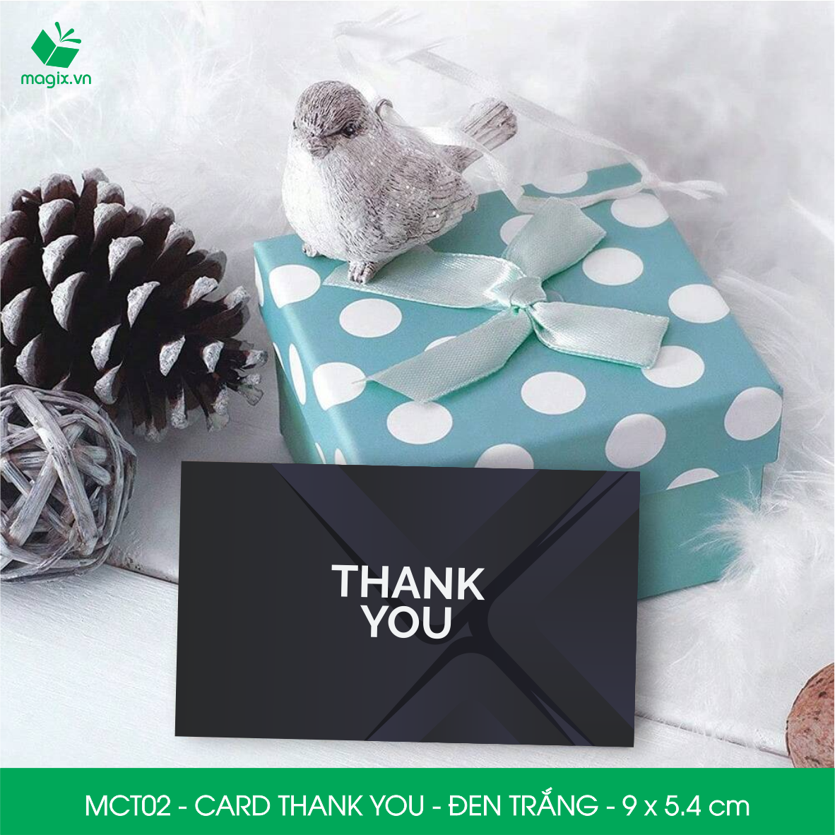 Card Thank You - Thiệp cảm ơn - Lời cảm ơn chân thành, ý nghĩa.   Thiệp cảm ơn là một sản phẩm không thể thiếu đối với các cửa hàng thời trang, shop bán hàng online và doanh nghiệp. Thiệp cảm ơn được sử dụng để đóng gói kèm theo sản phẩm hoặc dịch vụ đến khách hàng, nhằm thể hiện sự trân trọng, biết ơn. Đặc điểm Card Thank You - Thiệp cảm ơn làm từ giấy C300 và phủ màng mờ 2 mặt mang lại sự cứng cáp và sang trọng cho sản phẩm. Một tấm thiệp cảm ơn đẹp mắt, ấn tượng và ý nghĩa sẽ giúp doanh nghiệp ghi điểm trong mắt khách hàng, đối tác, đồng thời góp phần nâng cao hình ảnh thương hiệu. Card Thank You - Thiệp cảm ơn được in offset có thiết kế theo nhiều phong cách khác nhau, từ đơn giản đến sang trọng, tùy theo nhu cầu và mục đích sử dụng của người dùng.    Lợi ích của việc sử dụng Card Thank You - Thiệp cảm ơn: Thể hiện sự trân trọng, biết ơn đối với khách hàng, đối tá Góp phần nâng cao hình ảnh thương hiệu Tạo ấn tượng tốt đẹp trong lòng khách hàng, đối tác Giúp tăng cường lòng trung thành của khách hàng Tăng doanh số bán hàng.    QUY CÁCH KỸ THUẬT Mã sản phẩm:  MCT01 - Card Thank you - C300 - Đen trắng - 9x5.4 cm MCT02 - Card Thank you - C300 - Đen trắng - 9x5.4 cm MCT03 - Card Thank you - C300 - Xanh trắng - 9x5.4 cm MCT04 - Card Thank you - C300 - Đen trắng - 9x5.4 cm MCT05 - Card Thank you - C300 - Đen trắng - 9x5.4 cm MCT06 - Card Thank you - C300 - In nhiều màu - 9x5.4 cm MCT07 - Card Thank you - C300 - In nhiều màu - 9x5.4 cm MCT08 - Card Thank you - C300 - In nhiều màu - 9x5.4 cm Kiểu dáng: Hình chữ nhật Đóng gói: 50 tem/ pack Kích thước đóng gói: 9x5.4 cm Chất liệu: C300 - cán màng 2 mặt Màu sắc: Nhiều màu   LƯU Ý:  Bảo quản sản phẩm nơi khô ráo, sạch sẽ tránh tiếp xúc nơi có ánh sáng mặt trời và khu vực độ ẩm cao.
