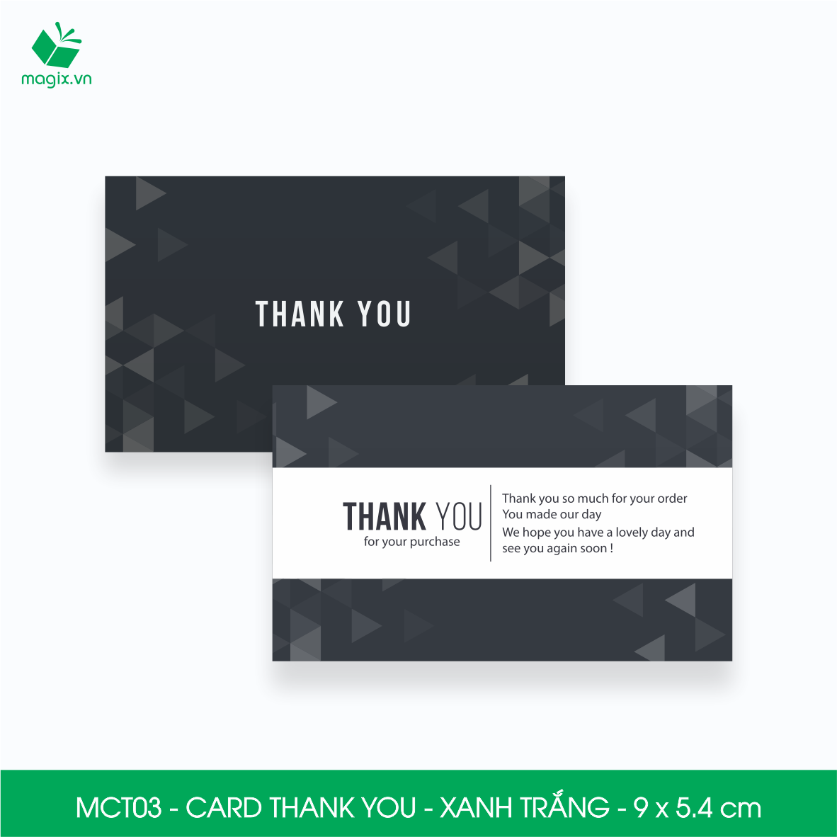 Card Thank You - Thiệp cảm ơn - Lời cảm ơn chân thành, ý nghĩa.   Thiệp cảm ơn là một sản phẩm không thể thiếu đối với các cửa hàng thời trang, shop bán hàng online và doanh nghiệp. Thiệp cảm ơn được sử dụng để đóng gói kèm theo sản phẩm hoặc dịch vụ đến khách hàng, nhằm thể hiện sự trân trọng, biết ơn. Đặc điểm Card Thank You - Thiệp cảm ơn làm từ giấy C300 và phủ màng mờ 2 mặt mang lại sự cứng cáp và sang trọng cho sản phẩm. Một tấm thiệp cảm ơn đẹp mắt, ấn tượng và ý nghĩa sẽ giúp doanh nghiệp ghi điểm trong mắt khách hàng, đối tác, đồng thời góp phần nâng cao hình ảnh thương hiệu. Card Thank You - Thiệp cảm ơn được in offset có thiết kế theo nhiều phong cách khác nhau, từ đơn giản đến sang trọng, tùy theo nhu cầu và mục đích sử dụng của người dùng.    Lợi ích của việc sử dụng Card Thank You - Thiệp cảm ơn: Thể hiện sự trân trọng, biết ơn đối với khách hàng, đối tá Góp phần nâng cao hình ảnh thương hiệu Tạo ấn tượng tốt đẹp trong lòng khách hàng, đối tác Giúp tăng cường lòng trung thành của khách hàng Tăng doanh số bán hàng.    QUY CÁCH KỸ THUẬT Mã sản phẩm:  MCT01 - Card Thank you - C300 - Đen trắng - 9x5.4 cm MCT02 - Card Thank you - C300 - Đen trắng - 9x5.4 cm MCT03 - Card Thank you - C300 - Xanh trắng - 9x5.4 cm MCT04 - Card Thank you - C300 - Đen trắng - 9x5.4 cm MCT05 - Card Thank you - C300 - Đen trắng - 9x5.4 cm MCT06 - Card Thank you - C300 - In nhiều màu - 9x5.4 cm MCT07 - Card Thank you - C300 - In nhiều màu - 9x5.4 cm MCT08 - Card Thank you - C300 - In nhiều màu - 9x5.4 cm Kiểu dáng: Hình chữ nhật Đóng gói: 50 tem/ pack Kích thước đóng gói: 9x5.4 cm Chất liệu: C300 - cán màng 2 mặt Màu sắc: Nhiều màu   LƯU Ý:  Bảo quản sản phẩm nơi khô ráo, sạch sẽ tránh tiếp xúc nơi có ánh sáng mặt trời và khu vực độ ẩm cao.
