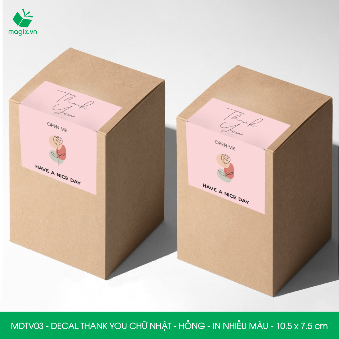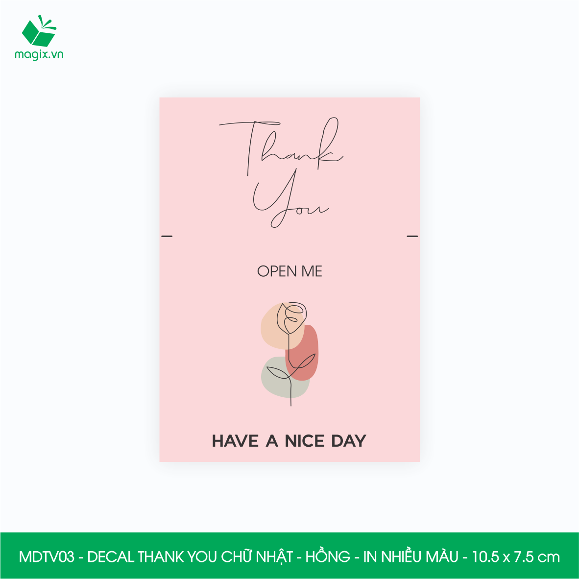 Decal - sticker Thank You là loại nhãn dán có nội dung "Cám ơn" được thiết kế theo hình chữ nhật. Decal Thank You thường được sử dụng để trang trí đóng gói thời trang,