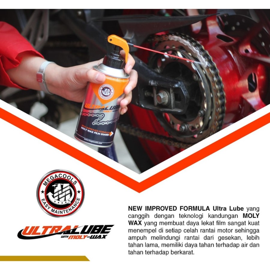 CÔNG THỨC CẢI TIẾN MỚI Ultra Lube tinh vi với công nghệ MOLY WAX giúp độ bám dính của màng rất mạnh chống lại mọi khe hở trong xích động cơ nên có tác dụng bảo vệ xích khỏi ma sát, bền hơn, chống nước và chống gỉ.