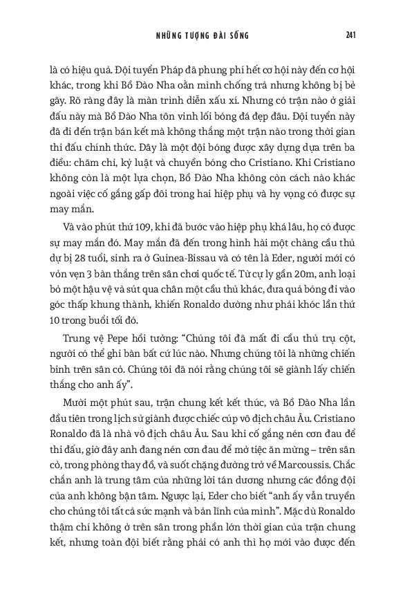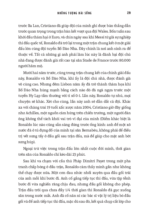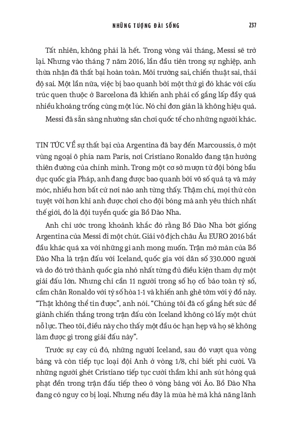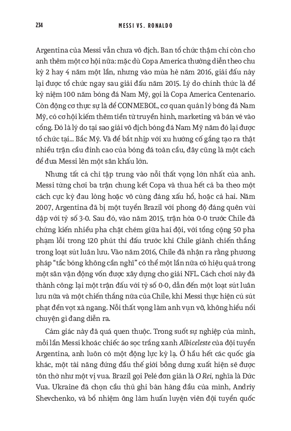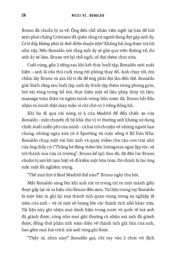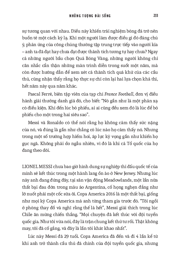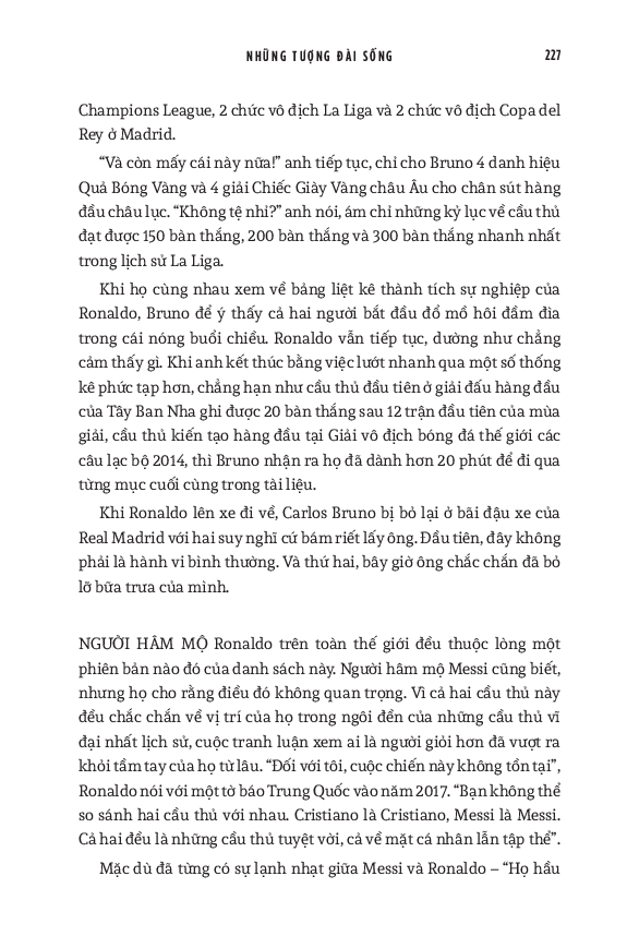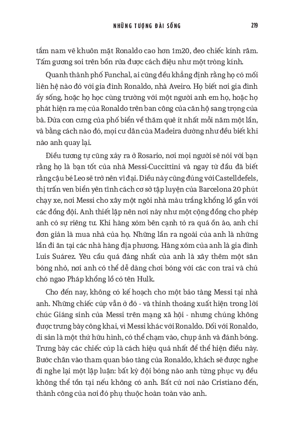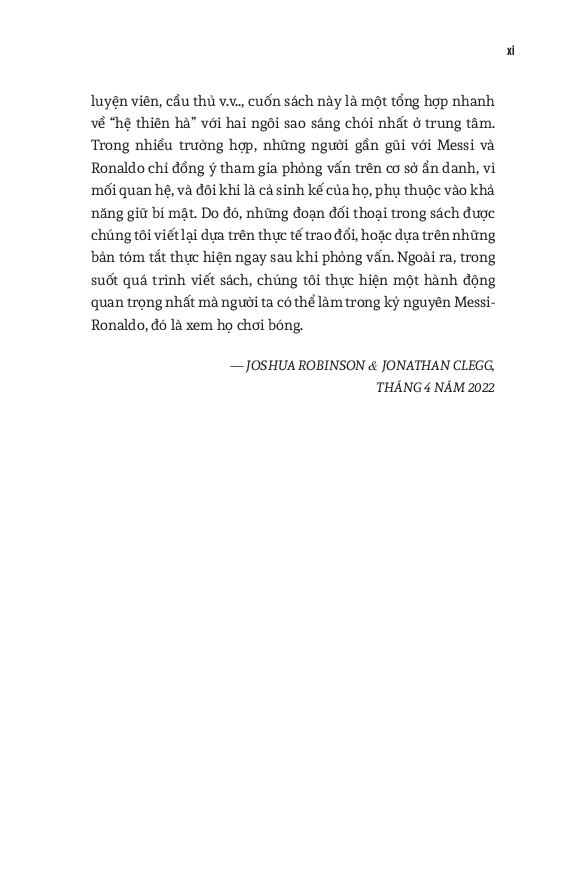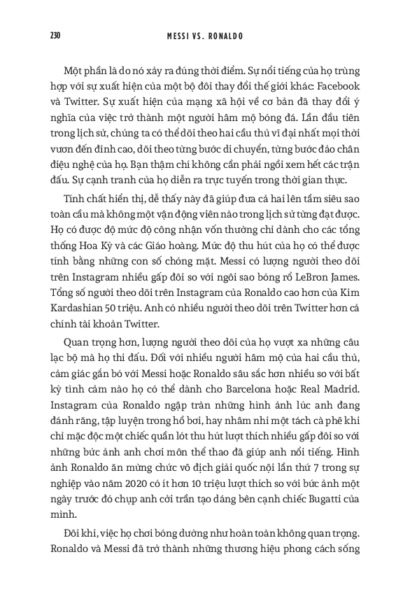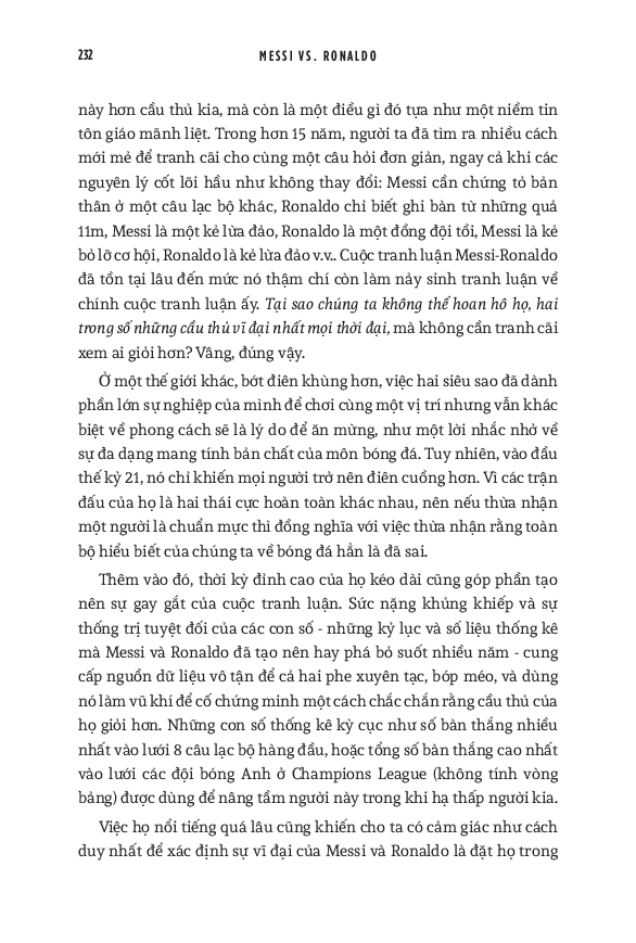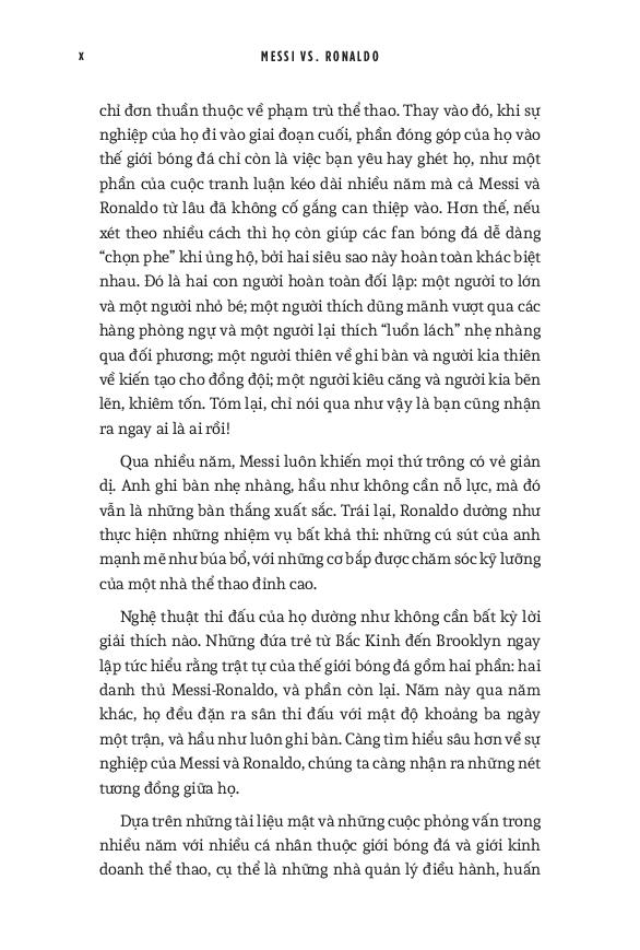 World Cup 2022 có lẽ là giải vô địch thế giới cuối cùng với cả Messi và Ronaldo. Do đó, cuốn sách này cũng dành nhiều trang đánh giá về di sản của họ cho bóng đá, cũng như phân tích những ảnh hưởng mà tài năng của họ tạo ra, cả tích cực lẫn tiêu cực. Hơn cả việc đơn thuần liệt kê những thành tích của hai siêu sao, đây thực sự là một “tiểu sử của cuộc đua tranh” vốn đã trở thành một lăng kính quan trọng để hiểu về quá khứ, hiện tại và tương lai của bóng đá thế giới.