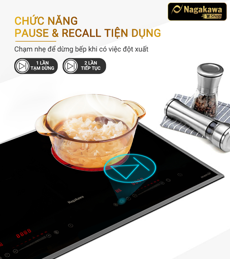 Khi bận việc đang lúc dở tay đun nấu, lúc này bạn có thể sử dụng phím Pause để tạm dừng hoạt động bếp. Khi trở lại, bạn chỉ cần ấn phím Pause một lần nữa, bếp đôi điện từ hồng ngoại Nagakawa NAG1252M sẽ tiếp tục hoạt động bình thường với chương trình đã cài đặt trước đó.