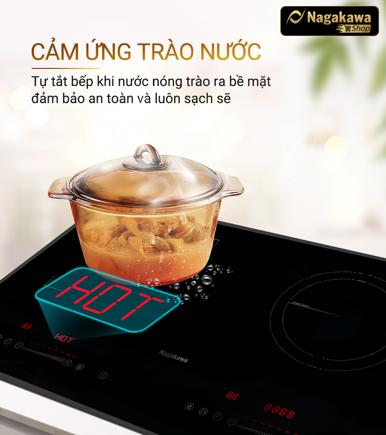 Cảm biến trào nước là một dạng cảm biến nhiệt của bếp đôi điện từ hồng ngoại Nagakawa NAG1252M, được đặt tại vị trí của bàn phím điều khiển. Trong quá trình nấu nướng, khi nước nóng trào ra bề mặt, bàn phím sẽ kích hoạt cảm biến tự tắt bếp, đảm bảo cho bếp luôn an toàn và sạch sẽ