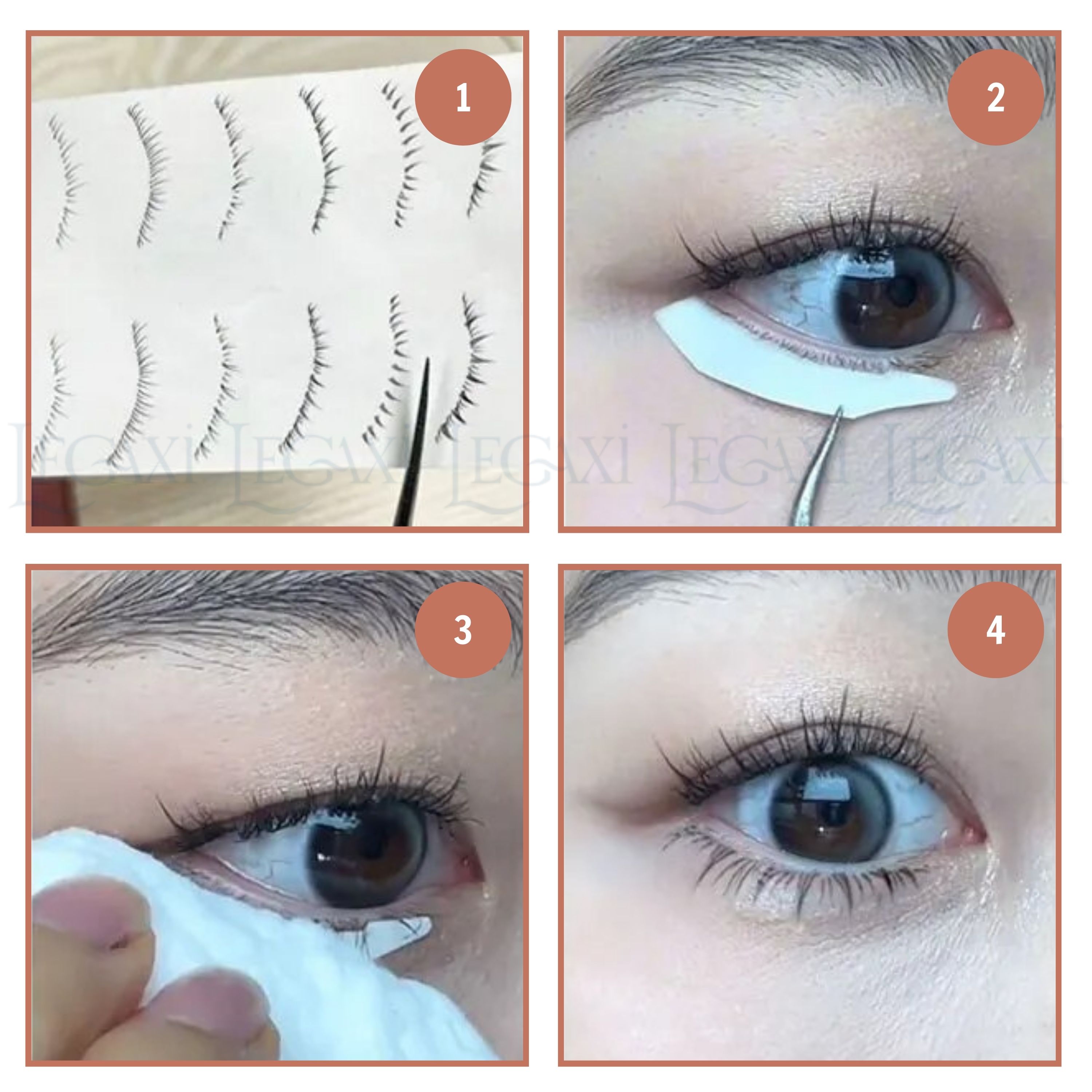 - Ướm thử lên mắt tìm vị trí phù hợp. (Không đè miếng dán lên lông mi thật, lật lông mi thật lên trên miếng dán)