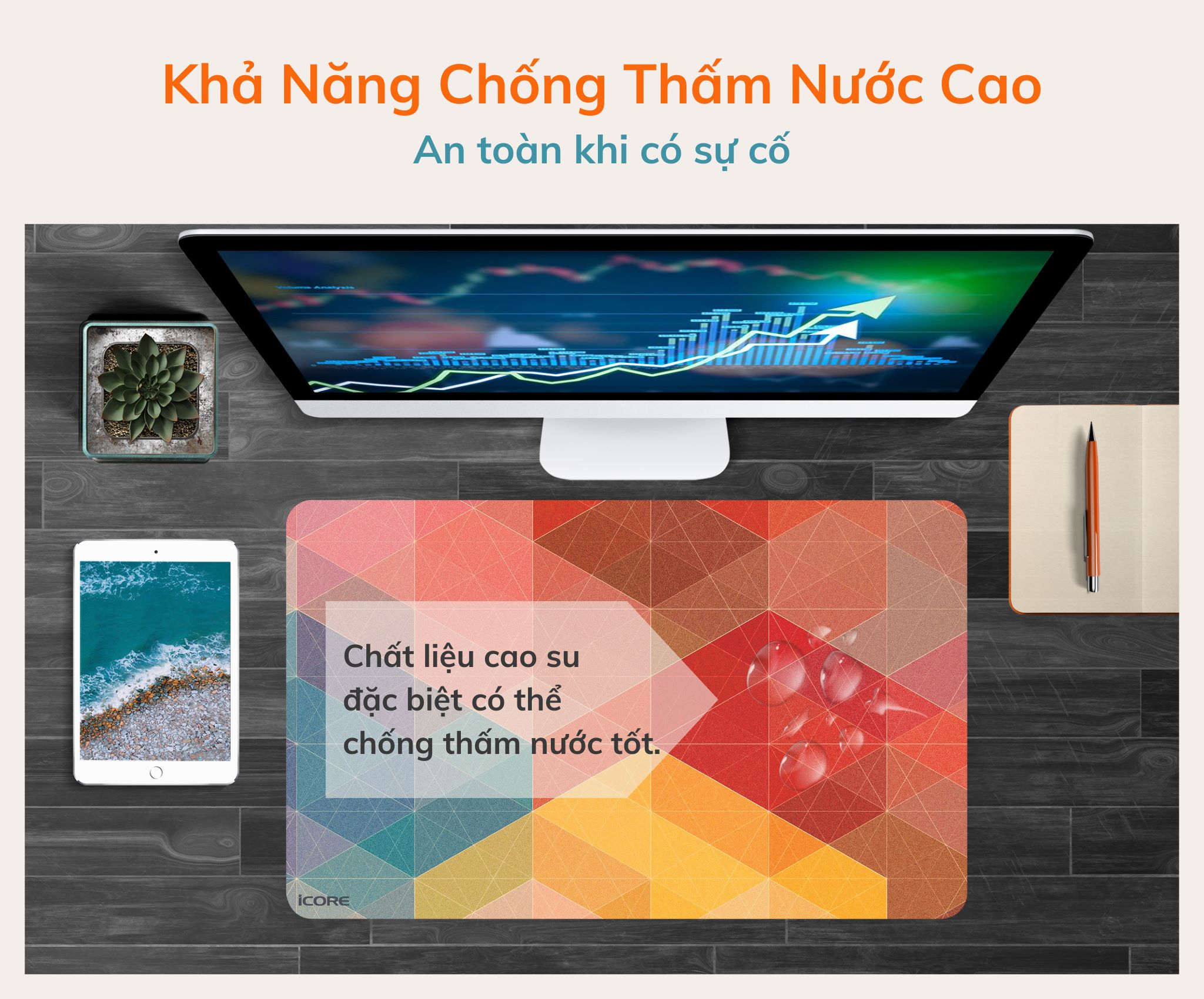 - Khả năng chống thấm nước: Chất liệu cao su đặc biệt có thể chịu được các chất lỏng như nước, cà phê, và đồ uống khác. Nếu bạn làm đổ chất lỏng lên Desk Pad iCore IMP680, chỉ cần lau sạch bằng khăn là được.