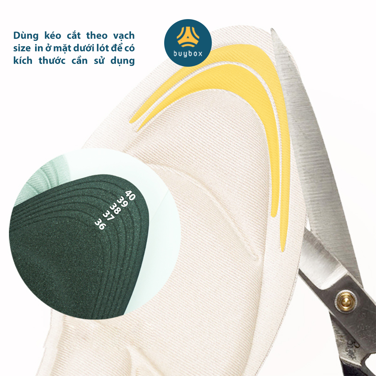 - Mặt dưới miếng lót in các đường cong tương ứng các size 35 - 36 - 37 - 38 - 39 - 40. Dùng kéo cắt theo các đường cong này để có được kích thước cần sử dụng.