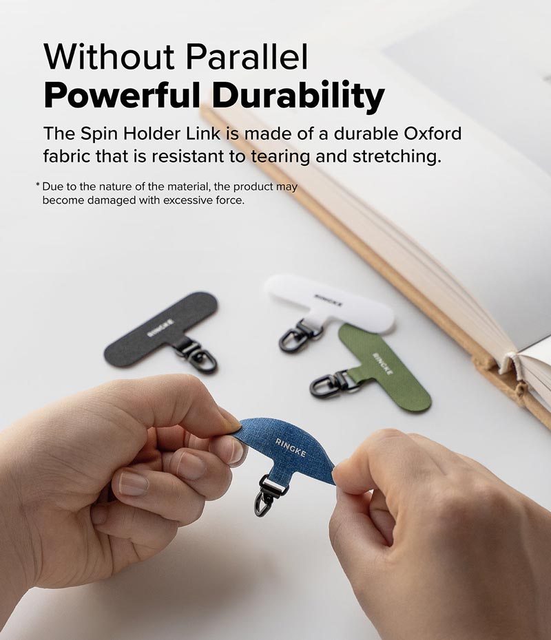 Miếng Spin Holder Link nhiều màu (dùng cho Holder Link Strap) Miếng Spin Holder Link nhiều màu có chất liệu vải sợi Oxford, nhiều màu sắc trẻ trung, cá tính và có kèm đầu kim loại xoay tròn 360 độ. Bạn có thể phối cùng tông màu với các sợi dây để tạo bộ sưu mix & match theo phong cách của bạn. Sản phẩm được dùng cùng với các loại dây đeo Ringke Straps. Đầu kim loại xoay tròn 360 độ giúp sử dụng dễ dàng hơn mà không lo dây đeo bị rối. Đặc biệt, bạn có thể sử dụng cùng các ốp lưng không có lỗ xỏ dây đeo. Hướng dẫn sử dụng Bước 1: Nhét miếng Holder Link vào phía trong ốp lưng, đầu khoen móc xỏ qua lỗ cắm sạc của ốp lưng như hình hướng dẫn bên dưới. Bước 2: Xỏ dây vào khoen móc của Holder Link. (Lưu ý: dây đeo được bán riêng) Thông số kỹ thuật Tên sản phẩm: Ringke Spin Holder Link Chất liệu: vải sợi Oxford, Polyester, Nylon, móc kim loại Kích thước: 60 x 43 x 0.8 mm Trọng lượng: 2.5 gram Thương hiệu: RINGKE – Xuất xứ: Trung Quốc Màu sắc có thể tuỳ chọn: DENIM BLUE, COTTON WHITE, CALM BLACK, OLIVE GREEN. Các lưu ý về sản phẩm