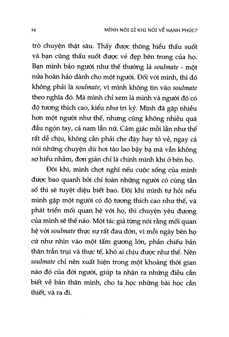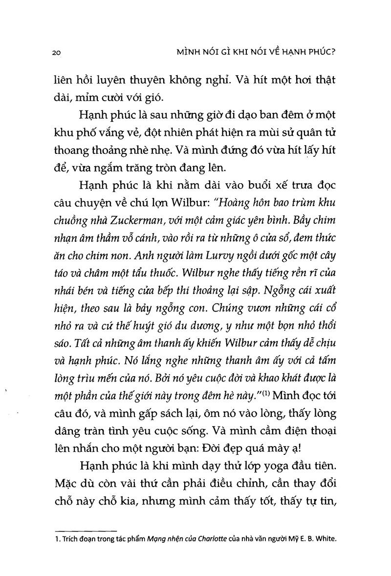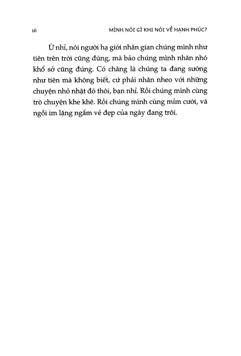 Như tắm mình trong dòng suối mùa xuân trong trẻo, như giữa trưa hè nếm một trái đào thanh mát, hay như ngồi trong quán nhỏ thân quen bên người bạn mến thương, Mình Nói Gì Khi Nói Về Hạnh Phúc? là những tâm sự và trải lòng trên hành trình sống và đi của Rosie Nguyễn, với những suy tư về hạnh phúc, về mục đích sống, về thân phận con người, cùng giọng kể thủ thỉ tâm tình, đem lại cảm giác nhẹ nhàng, sâu lắng, khi lấp lánh trong những câu chữ chính là vẻ đẹp của tình yêu cuộc sống.