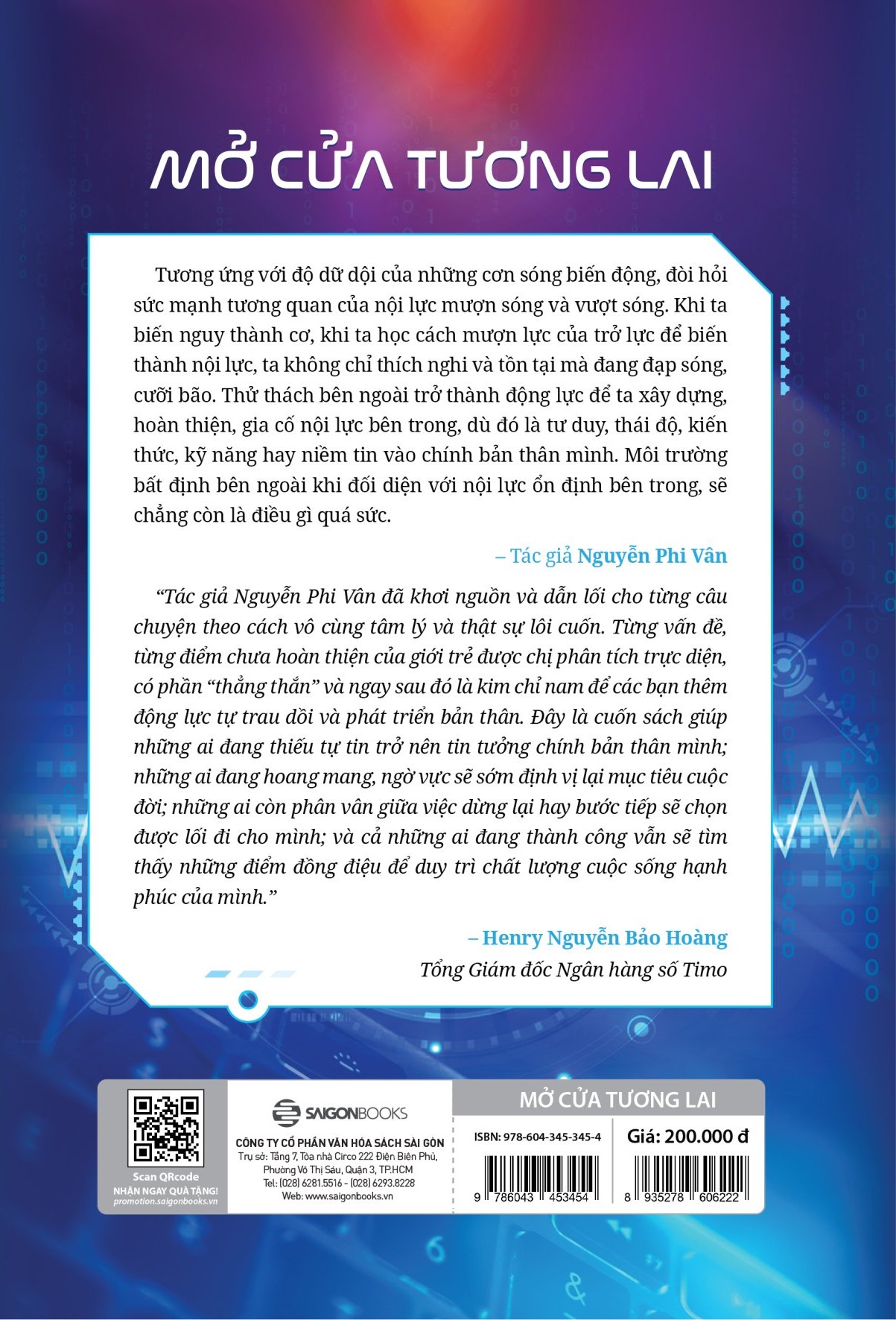 Biết bao nền văn minh đã đến, đã qua. Biết bao mùa trăng đầy rồi lại khuyết. Trái đất vẫn quay. Thảm họa đi rồi lại đến. Và con người vẫn mãi quay cuồng trong mong cầu, giữa ranh giới mong manh của hạnh phúc, khổ đau. Ừ, thì ngày khó khăn cứ đến, ngày gian khổ sẽ qua. Chuyện của trời sẽ vẫn cứ là chuyện của trời. Chuyện của người sẽ vẫn cuốn hút, thị phi, sẽ vẫn bày ra trên chợ đời dẫu còm nhiều còm ít. Nhưng câu chuyện đời mình, mấy ai chú ý? Ta liệu có đang quên ta, quên sứ mệnh của chính mình, quên hạnh phúc đời ta? Ngoài kia, đời dẫu biến động thế nào, người dẫu hay dở ra sao, hành trình của ta liệu có thay đổi theo cuộc đời của họ? Tương lai thuộc về người bắt kịp sự thay đổi và chuẩn bị đủ để nắm lấy thời cơ. Chào mừng các bạn đến với hành trình MỞ CỬA TƯƠNG LAI cùng tác giả Nguyễn Phi Vân! Tác giả Nguyễn Phi Vân có nói trong Mở cửa tương lai rằng: Resilience – sự kiên cường – là một phẩm chất quan trọng hàng đầu của thế kỷ 21 khi tương lai đầy bất định, khi các yếu tố tạo nên thành công biến hóa thay đổi khôn lường, khi thay đổi nhanh, cải tiến hiệu chỉnh liên tục sau mỗi thử nghiệm thất bại là con đường dẫn đến thành công. Nghiệt ngã thay, đó cũng là từ khóa vật vã nhất với người trẻ. Một phần do hoàn cảnh sinh thành đầy đủ, được ấp ủ bảo bọc và bày sẵn cỗ mâm, tự thân môi trường và gia đình đã tước đi của những người trẻ khả năng tự lực cánh sinh, tự chịu trách nhiệm với bản thân, tự đứng lên khi vấp ngã. Nhà trường thì tập trung dạy kiến thức, rất ít nơi coi trọng việc rèn luyện kỹ năng sống, kỹ năng làm việc và hội nhập tương lai cho thế hệ mà họ đang dìu dắt, nên tạo ra những thế hệ bằng cấp, điểm số lỗi thời nhưng sáng ngời. Có điều, mảnh skill lận lưng để tự thân tồn tại, tự sống cuộc đời của chính mình, tự đối diện với bao nghiệt ngã ngoài kia hoàn toàn trống vắng. Họ thiếu chính kiến, trôi dạt theo đám đông, lan man trên mạng xã hội, dõi theo cuộc đời người khác. Sự trỗi dậy của công nghệ chẳng giúp được gì ngoài việc tăng tốc cảm giác rất hối hả nhưng lớt phớt trên bề mặt, muốn tức thì nhưng bỏ cũng tức thời. Resilience trở thành một thứ phẩm chất xa xỉ, không có trong tự điển, thiếu trending và không đủ độ hot để quan tâm. Con người ta chỉ lớn khi biết ngừng đổ thừa, ngưng dựa dẫm, và tự chịu trách nhiệm với bản thân. Không có bí kíp thành công tức thì. Càng không có bánh trung thu thành đạt được đúc sẵn trao tận tay, dâng tận miệng. Không học tự đứng lên sau vấp ngã, không học thử nghiệm, sai sót, thất bại vài ngàn lần để eureka, không lì đòn, đời đánh mãi tớ chả thèm gục đâu, thì lấy ở mô ra thành tựu? Với tác giả Nguyễn Phi Vân, Mở cửa tương lai không phải hành trình mang độc giả tới một chân trời mới, nơi có những thứ công nghệ hợp thời hay những kỹ năng sinh tồn phải có trong thời đại số, Mở cửa tương lai giúp những ai đang thiếu tự tin trở nên tin tưởng chính bản thân mình; những ai đang hoang mang, ngờ vực sẽ sớm định vị lại mục tiêu cuộc đời; những ai còn phân vân giữa việc dừng lại hay bước tiếp sẽ chọn được lối đi cho mình; và cả những ai đang thành công vẫn sẽ tìm thấy những điểm đồng điệu để duy trì chất lượng cuộc sống của bản thân.